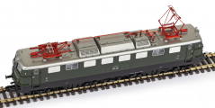 | elektrická lokomotiva tmavě zelená s černým rámem, stříbrná střecha, červené pantografy |