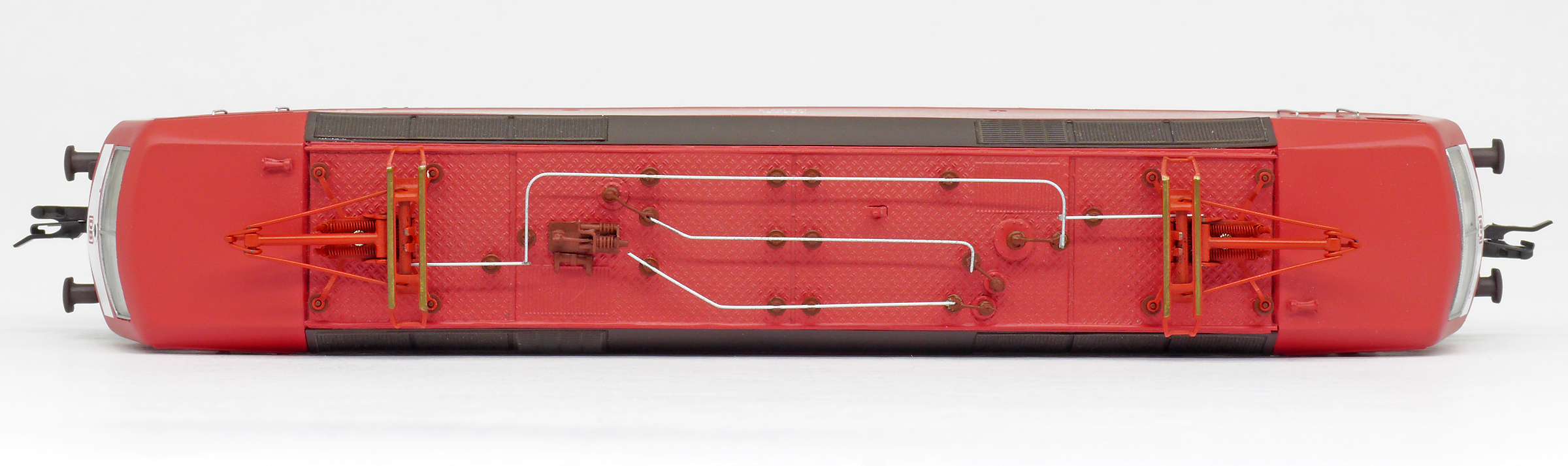 | elektrická lokomotiva červená s tmavěhnědým pojezdem |
