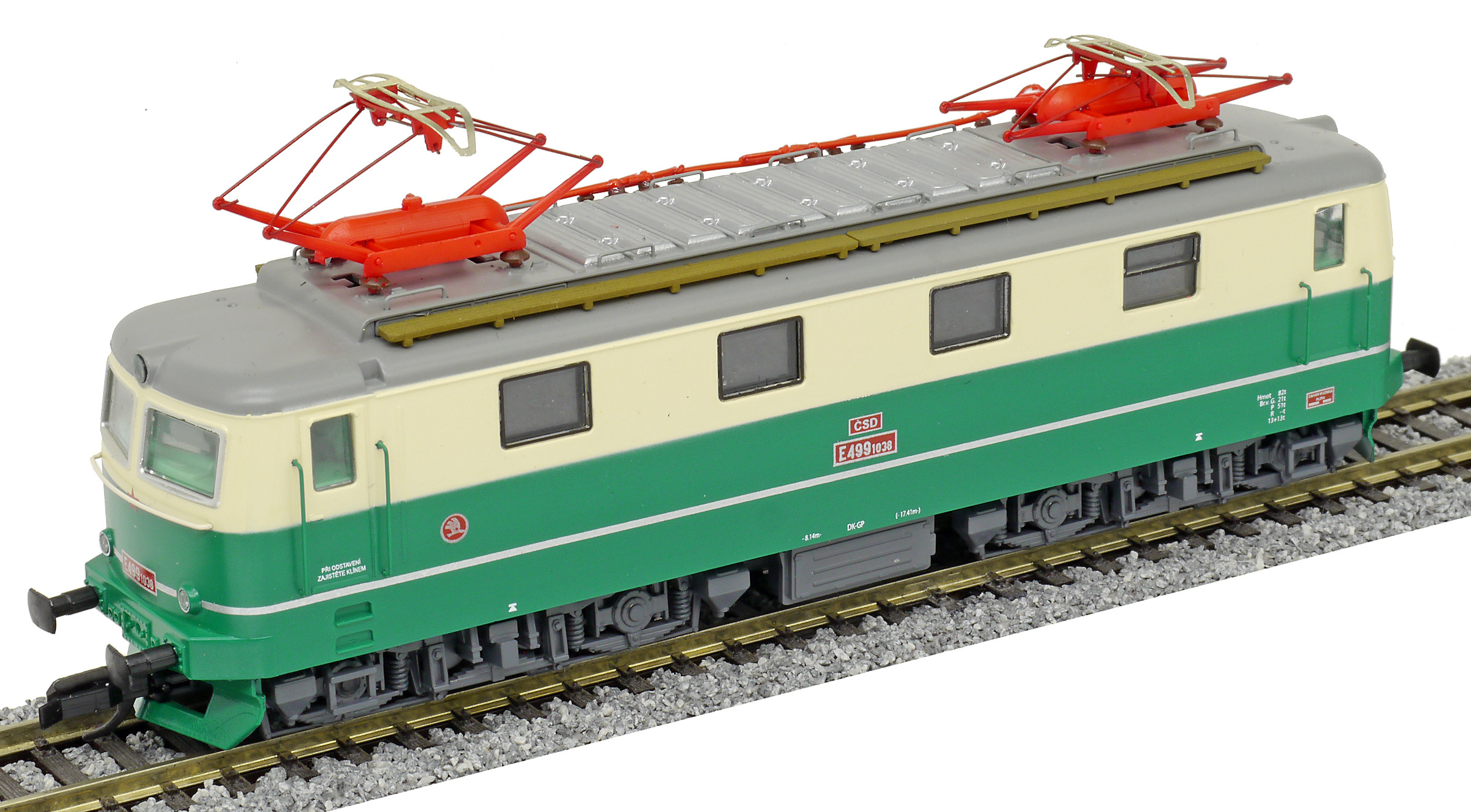 Kód   CD-141-046  [Lokomotivy] → [Elektrické] → [E499.1/E469.1] → CD-141-046: elektrická lokomotiva zelená-slonová kost, šedá střecha, oranžový výstražný pruh