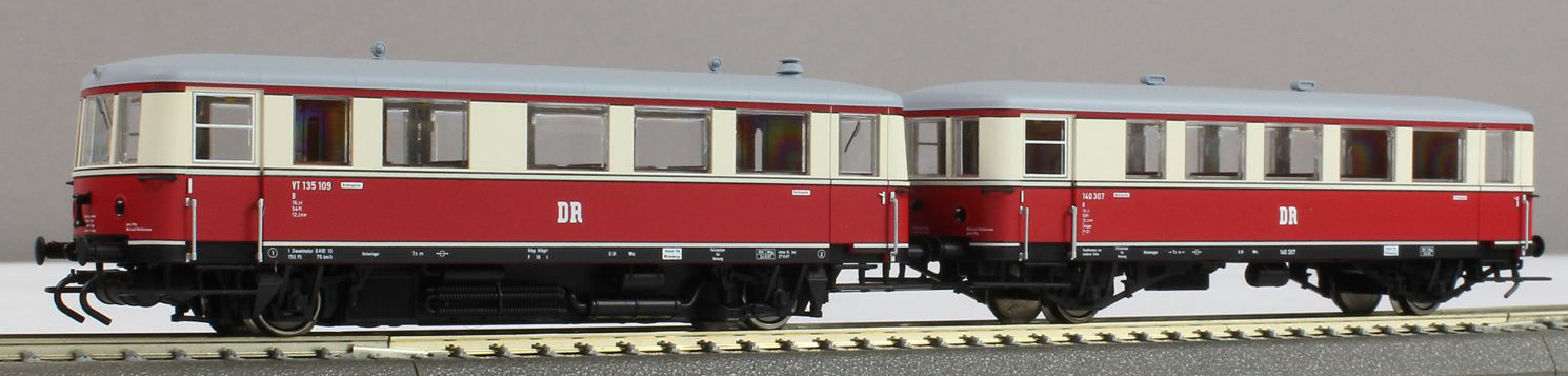 Kód   1351401  [Lokomotivy] → [Motorové vozy a jednotky] → [VT 135] → 1351401: červený-slonová kost s šedou střechou, motorový vůz a přívěsný vůz