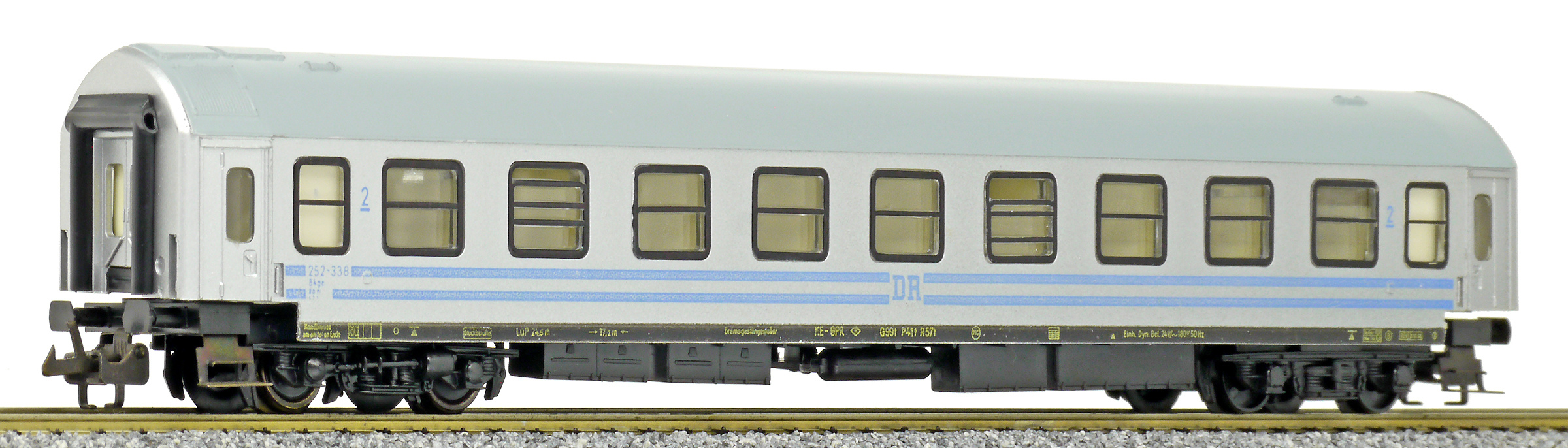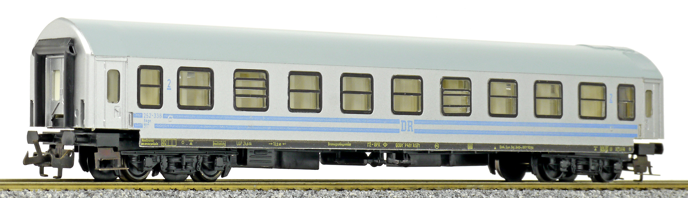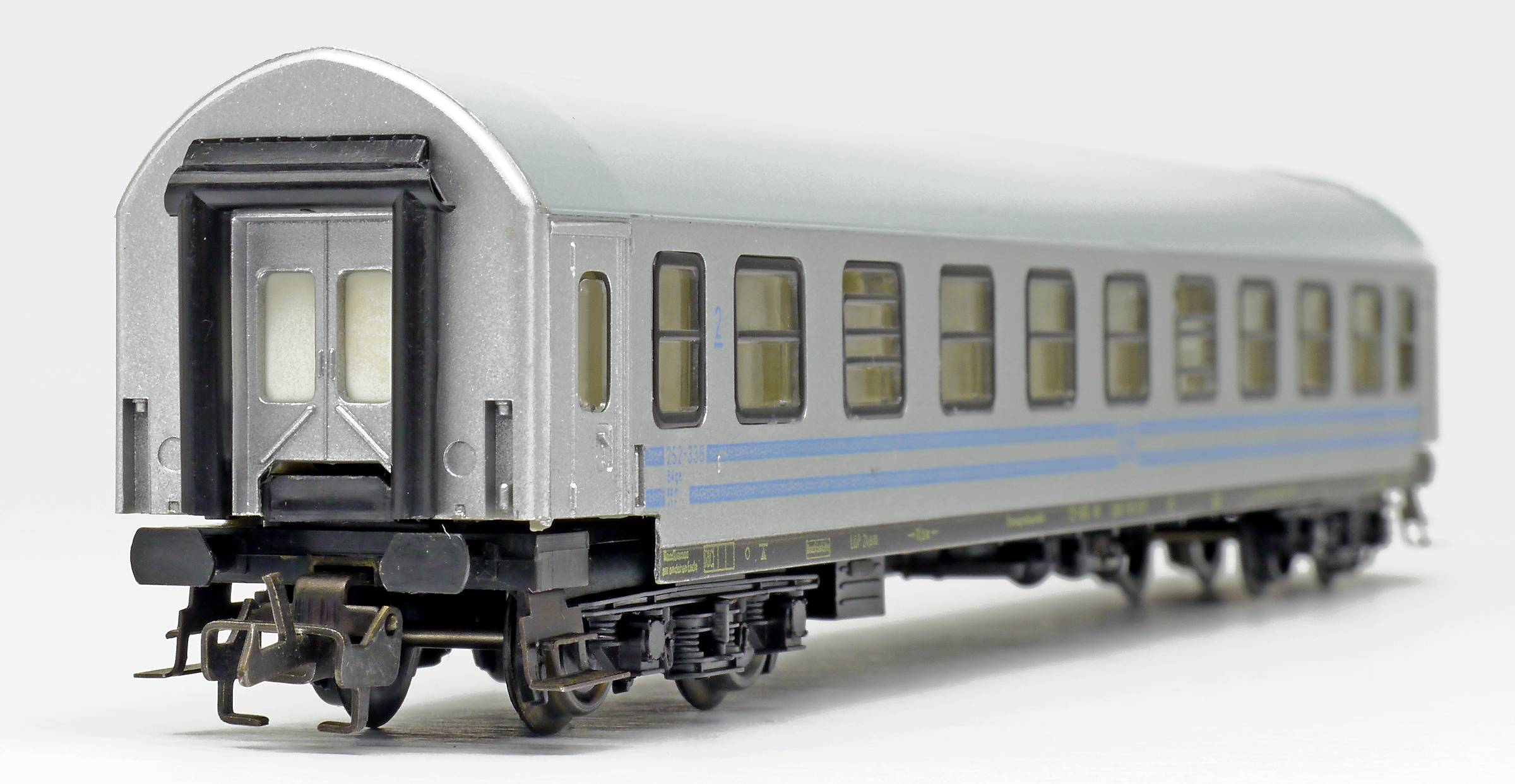 | rychlíkový vůz stříbrný se dvěma modrými proužky a s šedou střechou 2. tř. |
