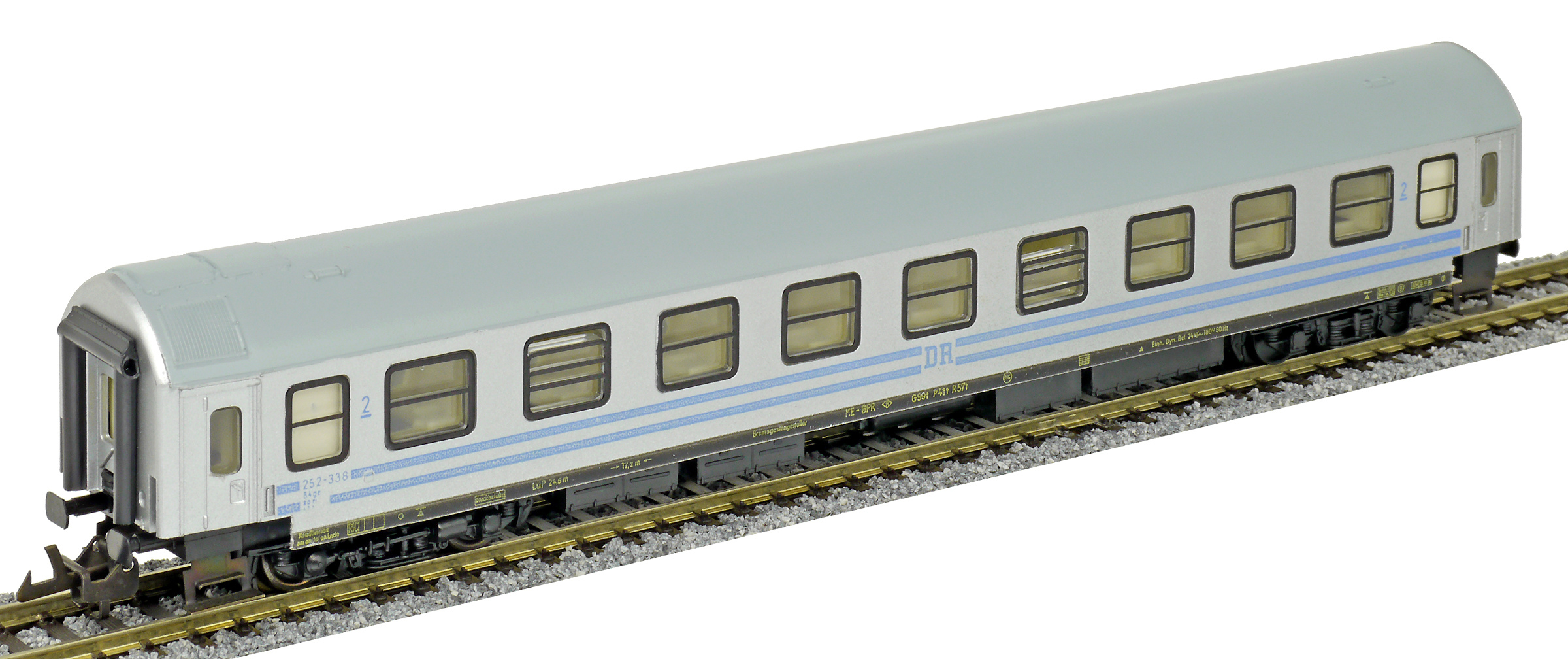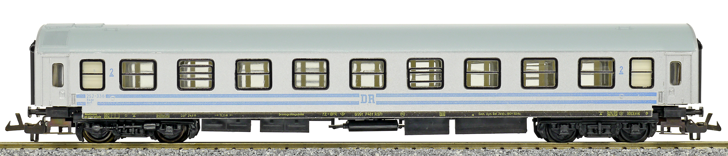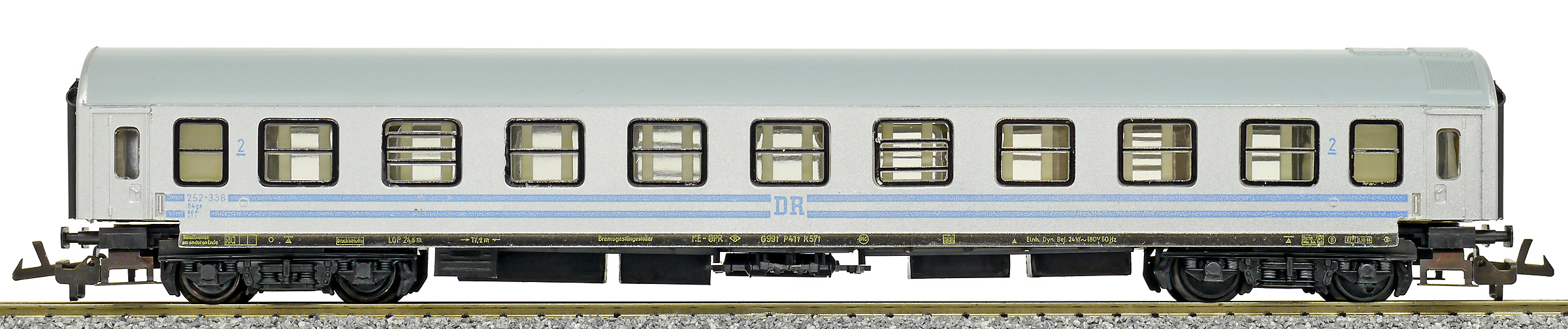 | rychlíkový vůz stříbrný se dvěma modrými proužky a s šedou střechou 2. tř. |