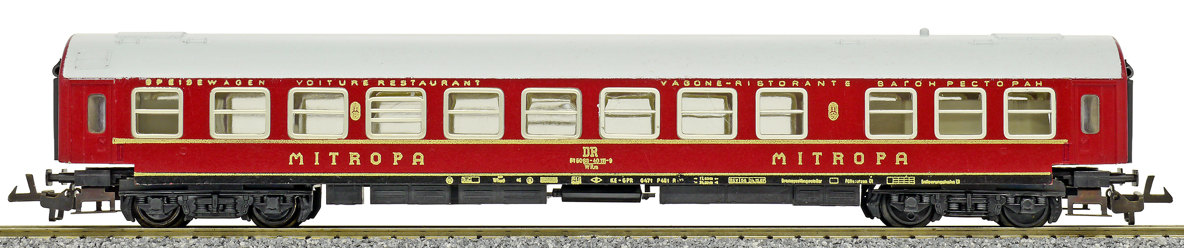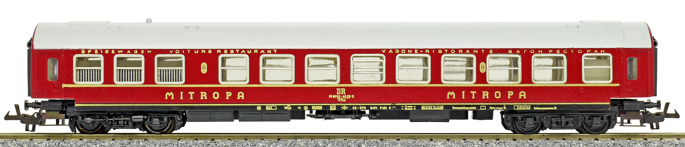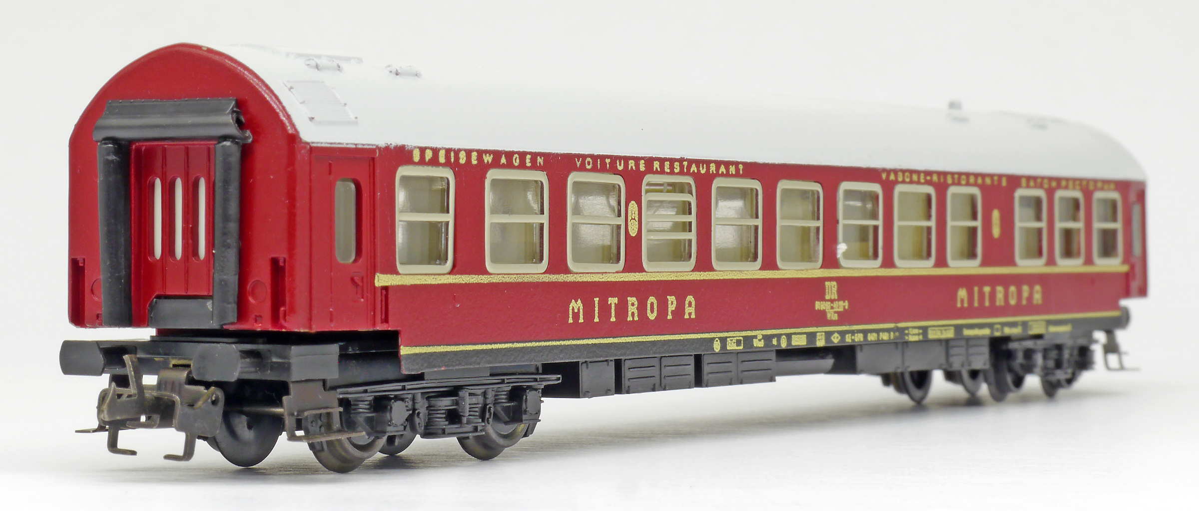 | jídelní vůz červený s šedou střechou jídelní „MITROPA“ |