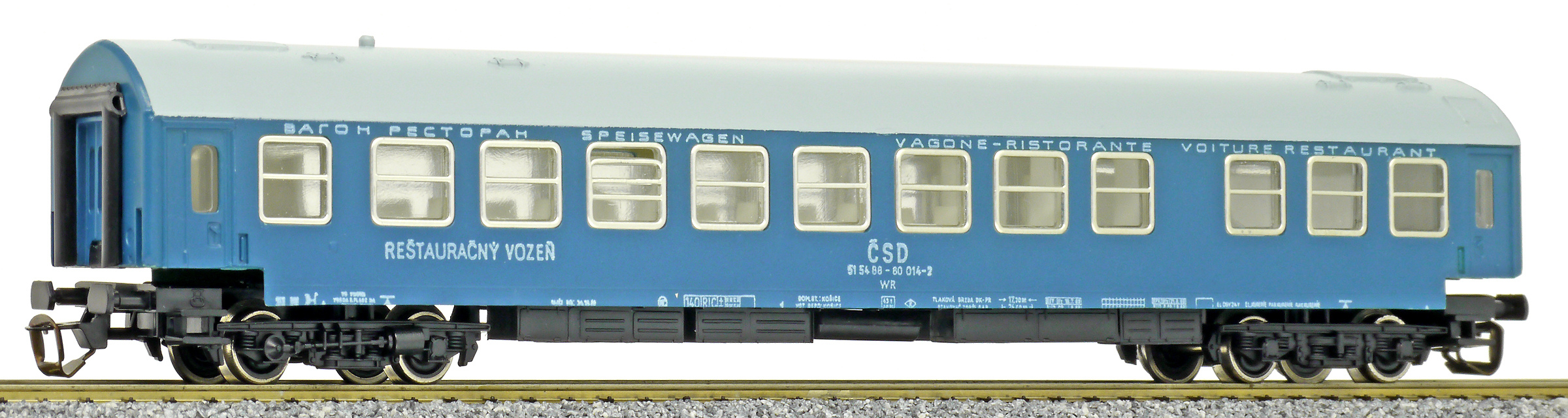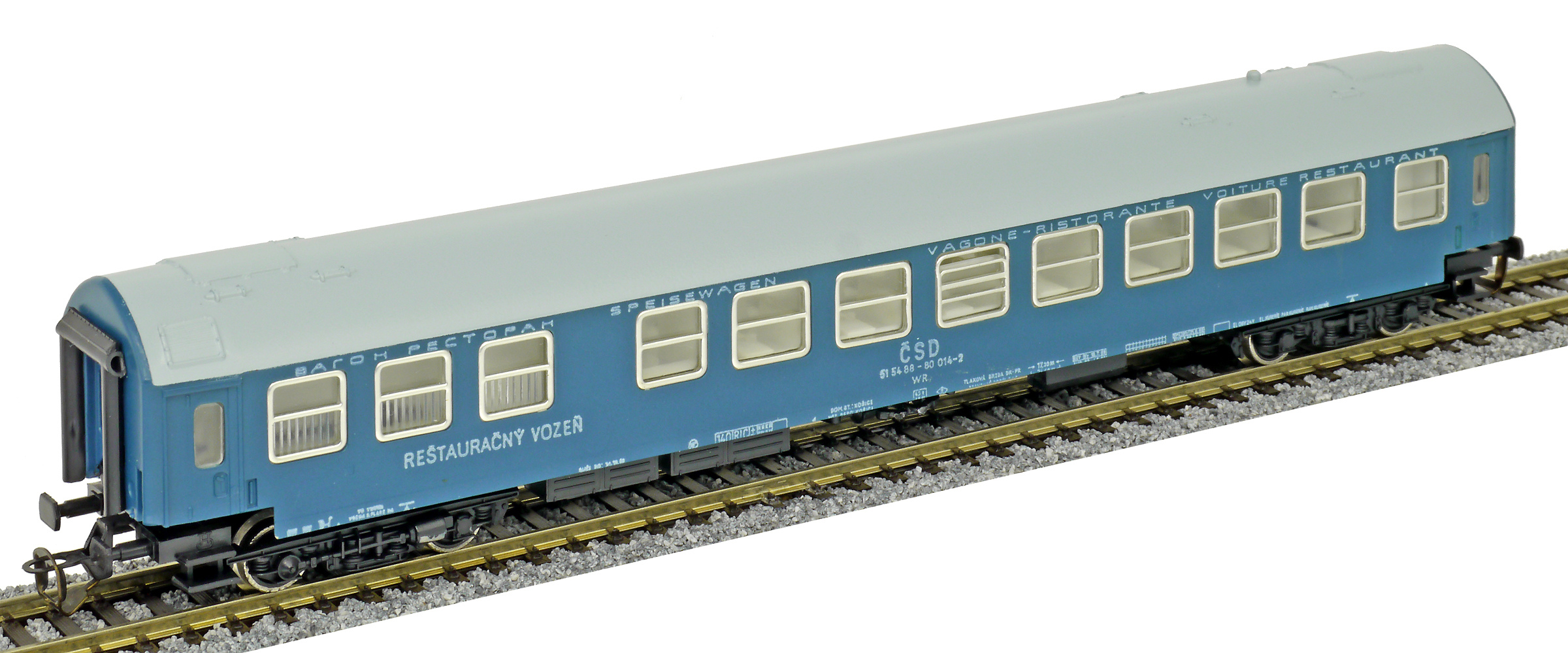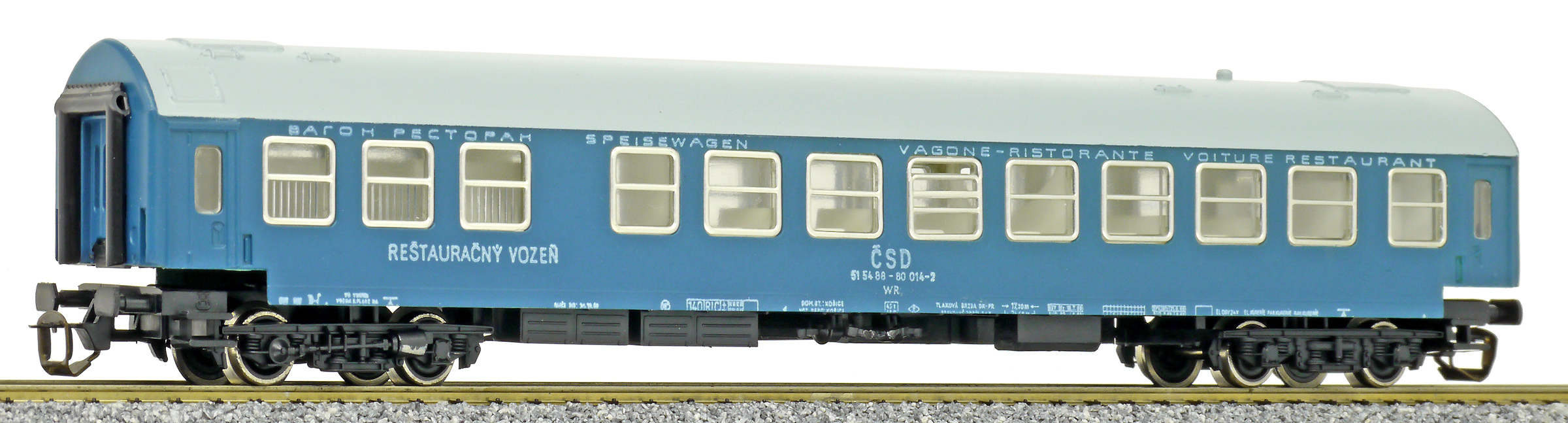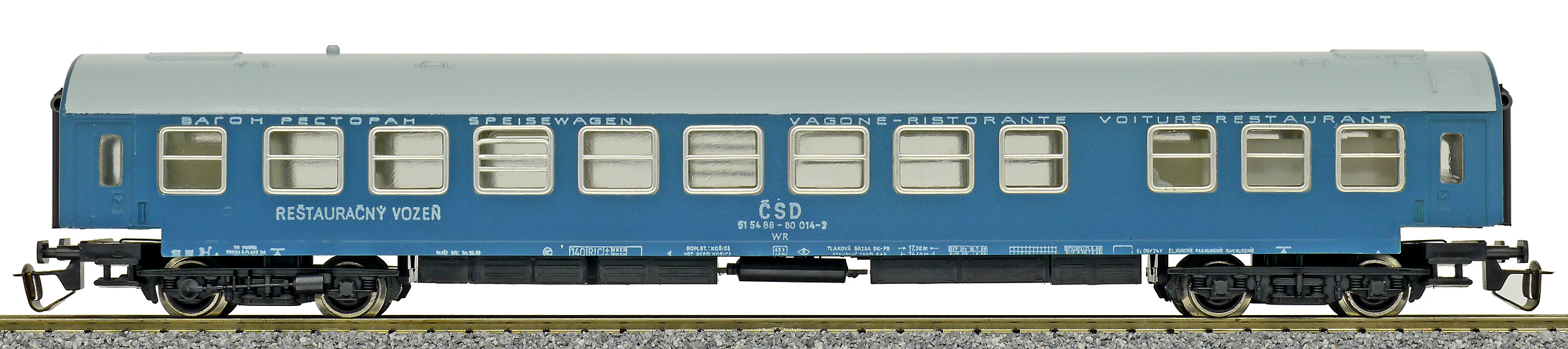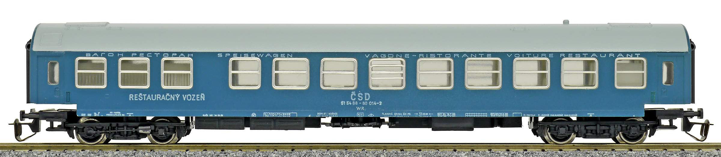 Kód   01452   ze SETu   [Osobní vozy] → [Rychlíkové] → [typ Y] → 01452: jídelní vůz modrý s šedou střechou „Touristenexpress“