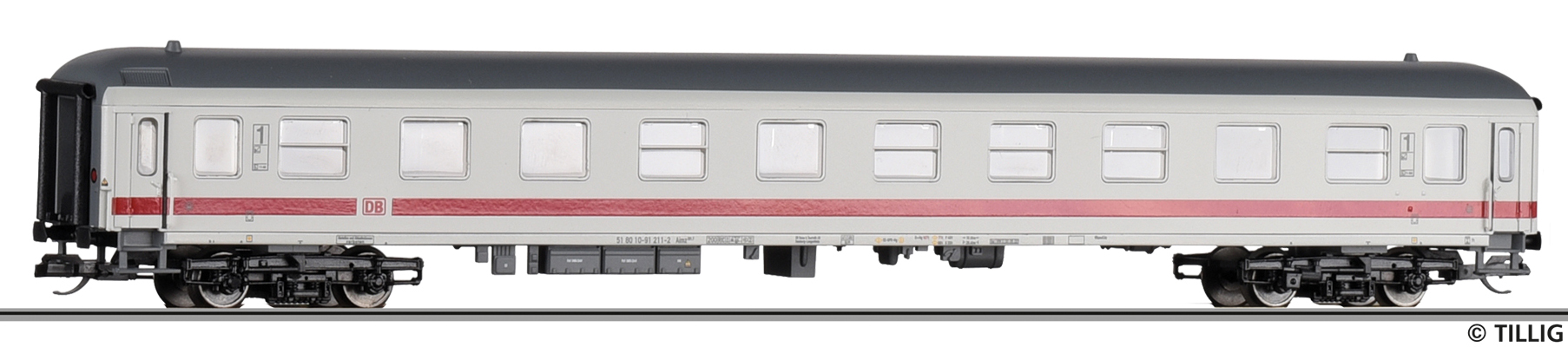Kód   16101 E  [Osobní vozy] → [Rychlíkové] → [typ m v barvách IC-aktuální] → 16101 E: rychlíkový vůz bílý s červeným pruhem 1. tř.