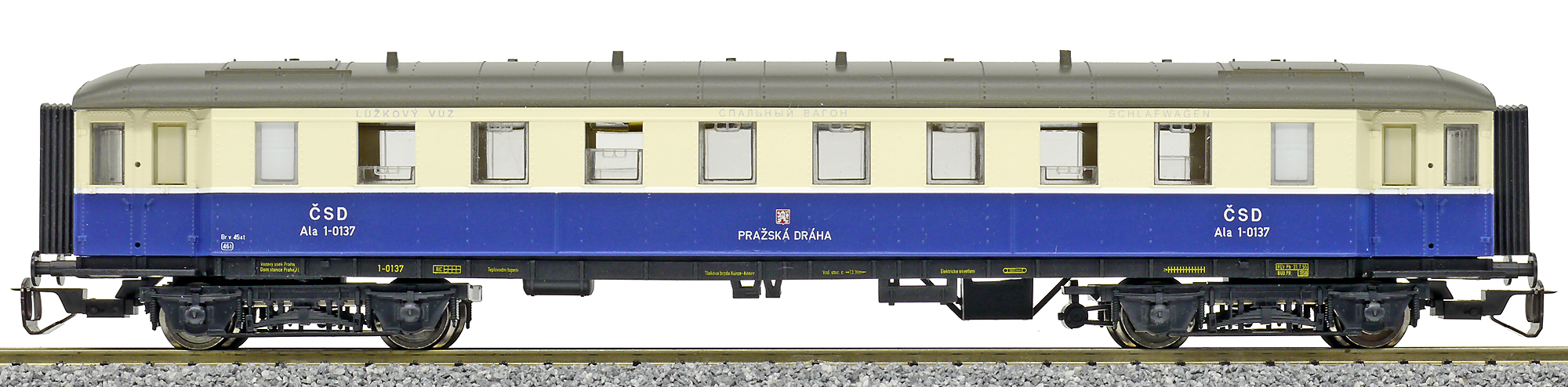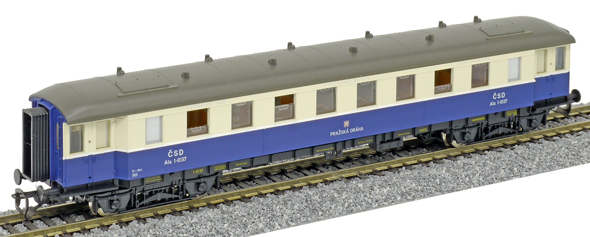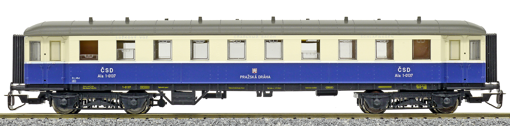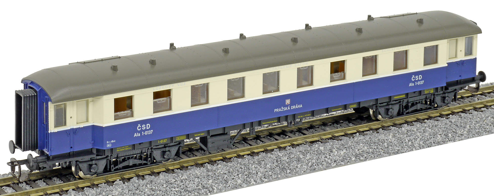 Popis   tmavěmodrý-slonová kost s šedou střechou lůžkový vůz