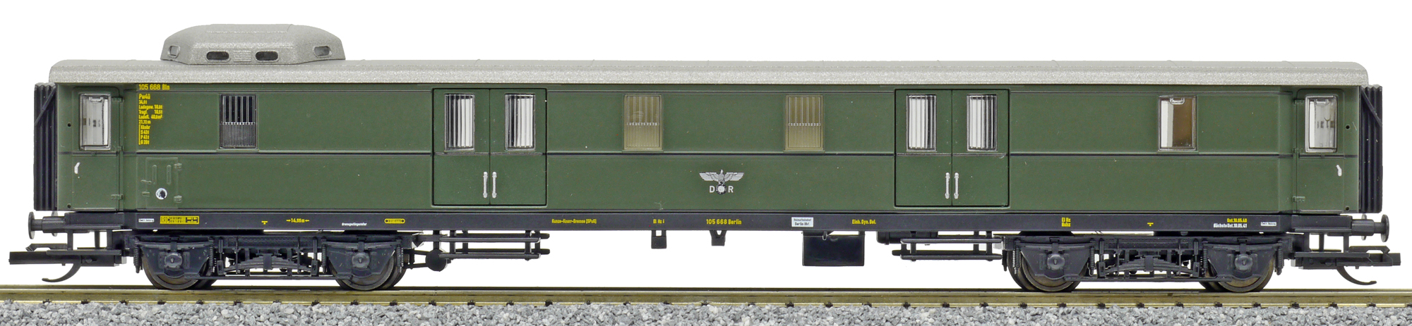 Kód   13397  [Osobní vozy] → [Spěšné a osobní] → [4-osé spěšné] → 13397: zavazadlový vůz zelený s šedou střechou