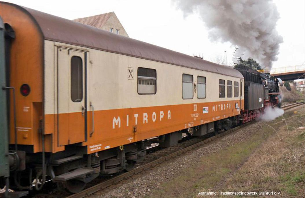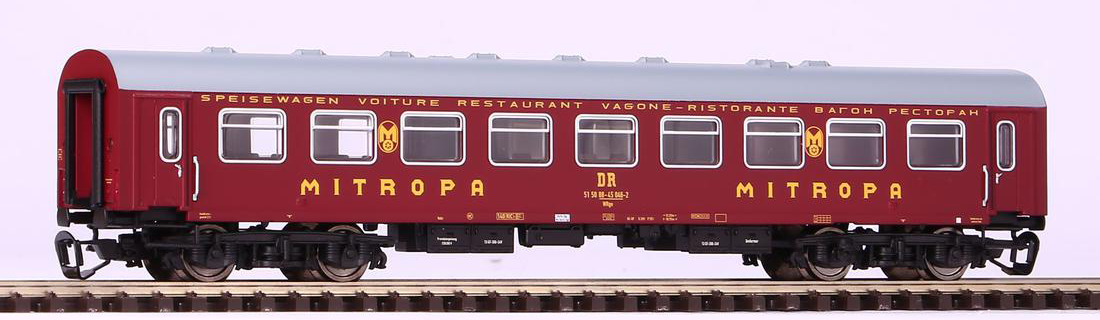 Kód   13750  [Osobní vozy] → [Spěšné a osobní] → [4-osé rekonstruované] → 13750: jídelní vůz červený s šedou střechou „MITROPA“