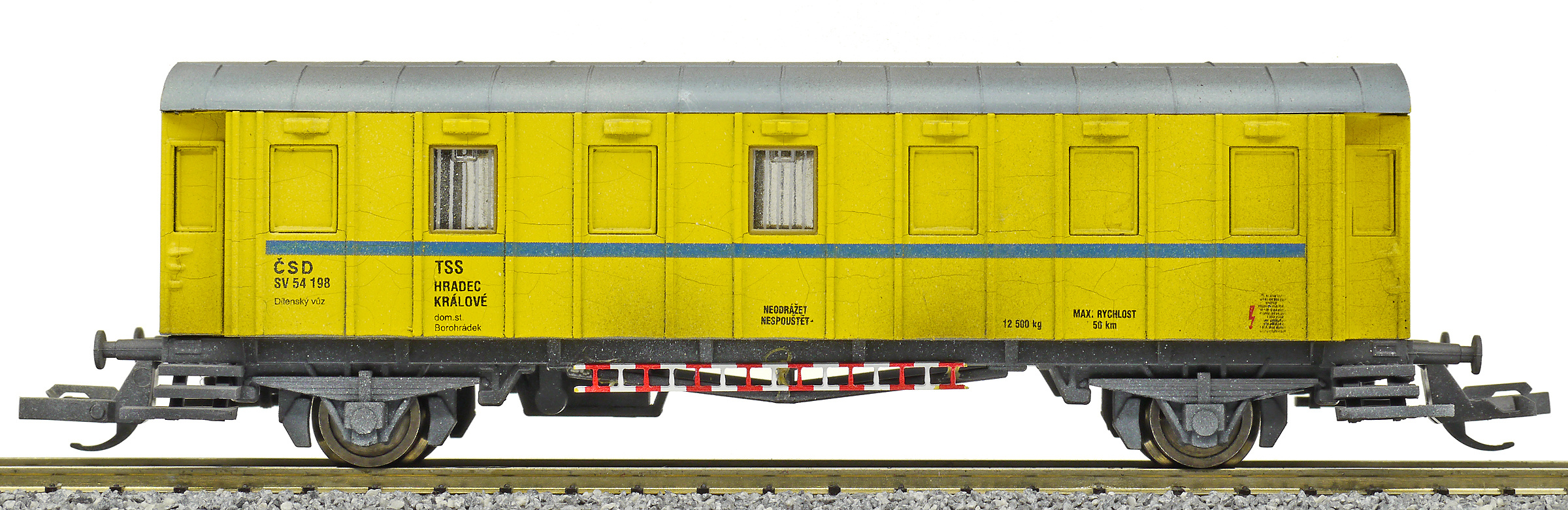 | dílenský vůz žlutý s modrým proužkem a šedou střechou |