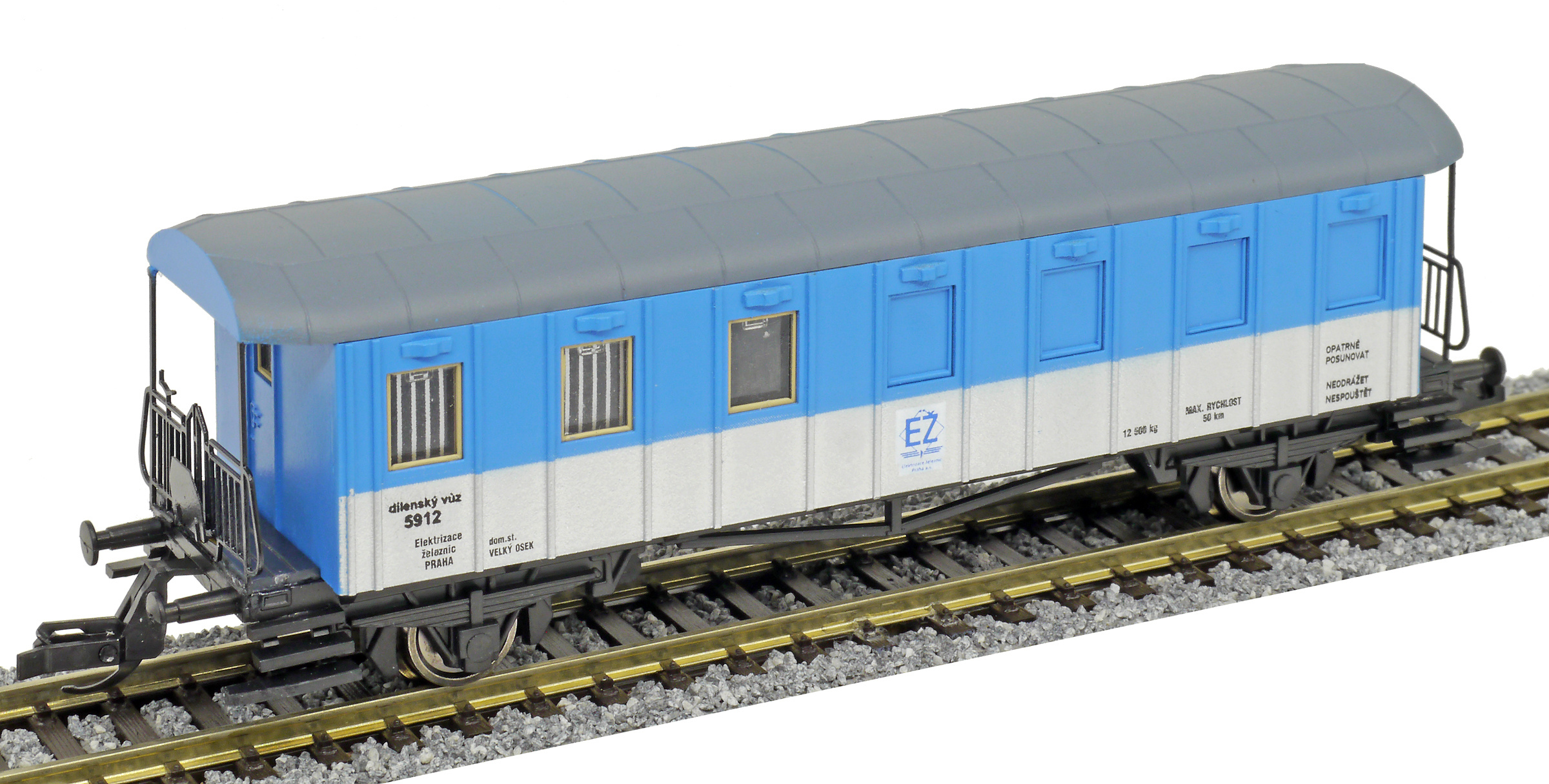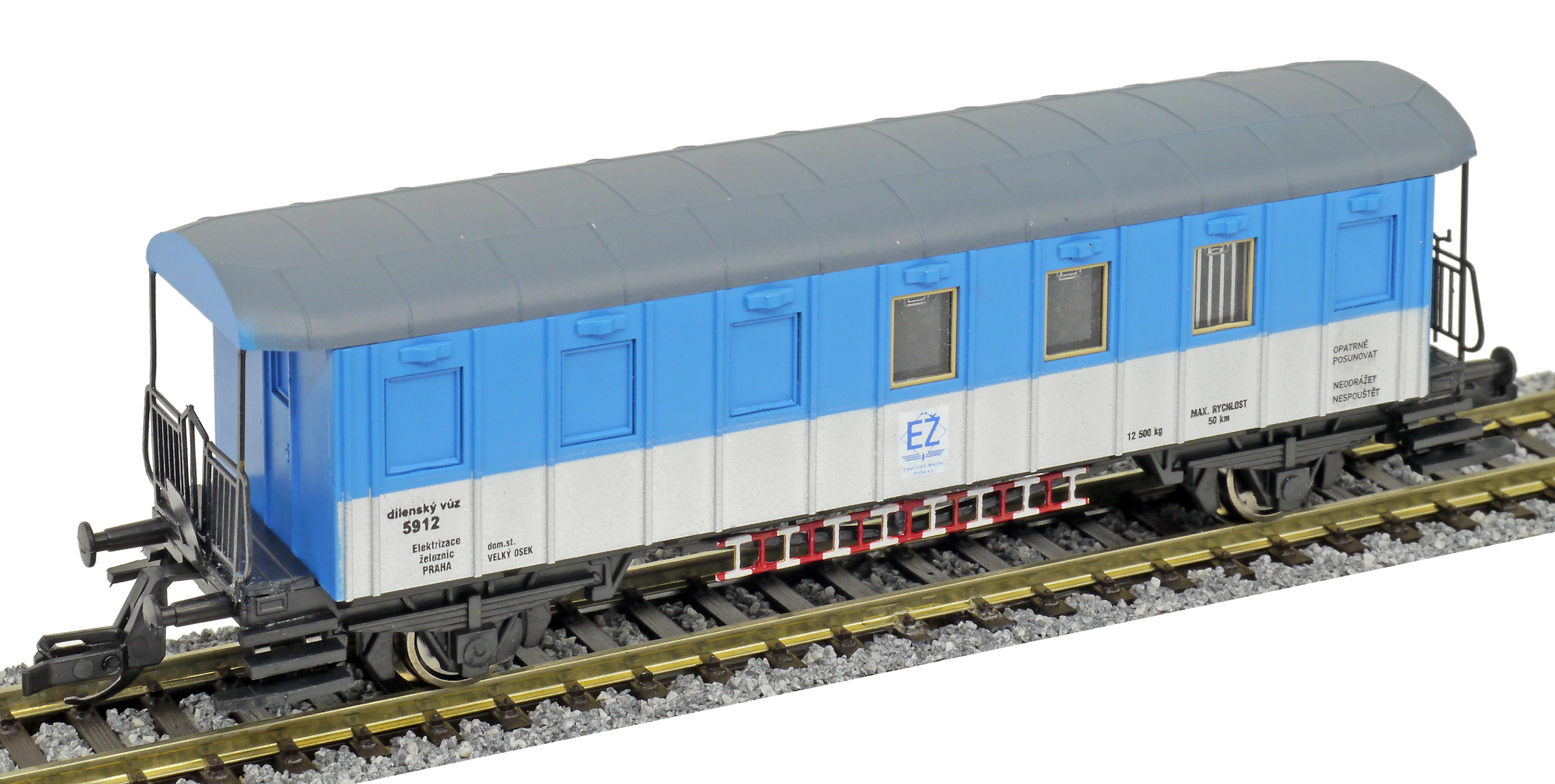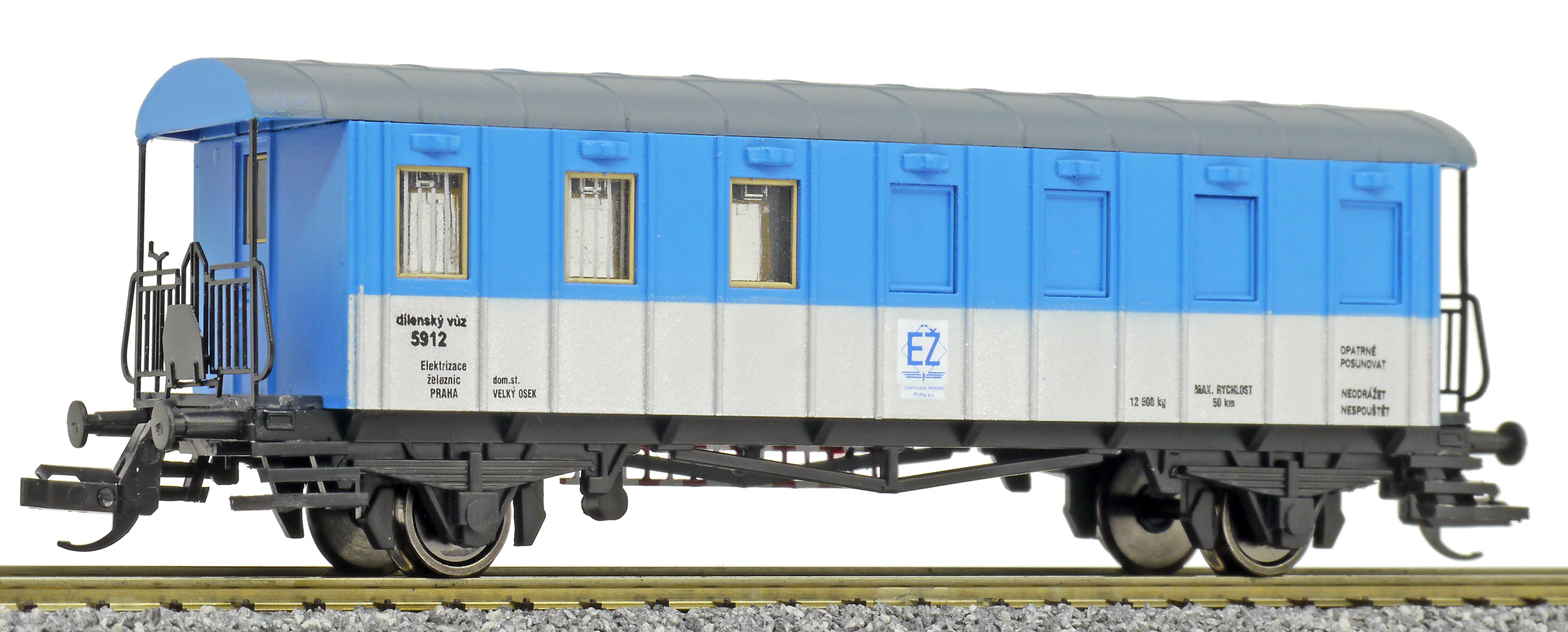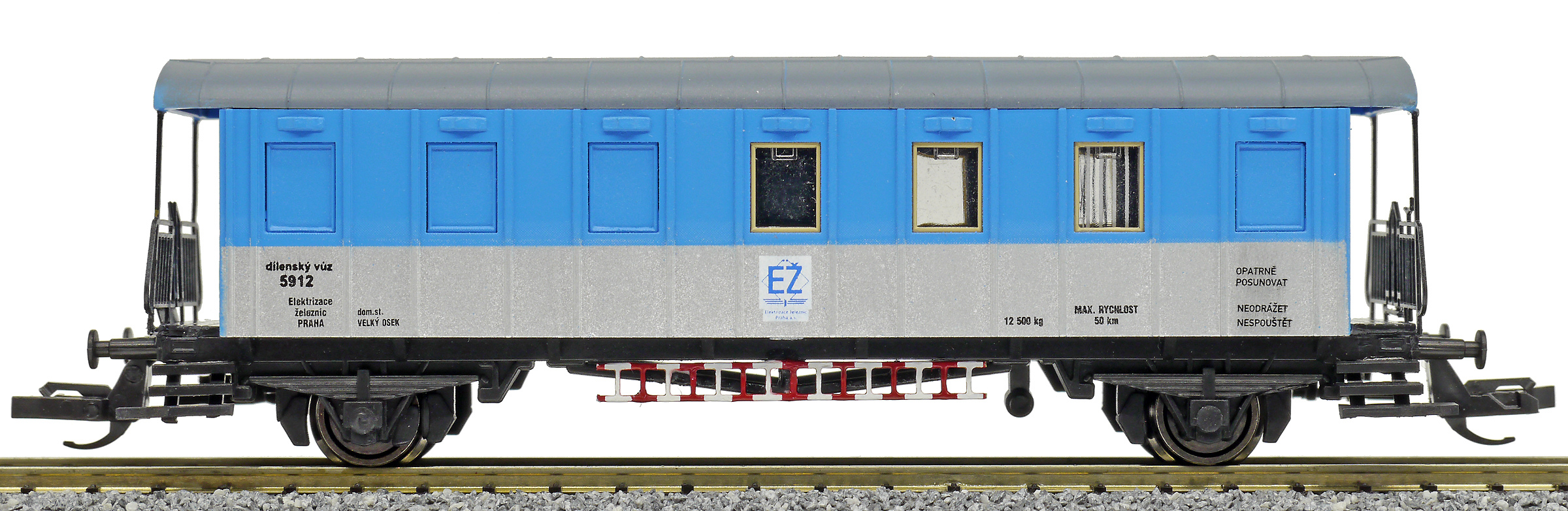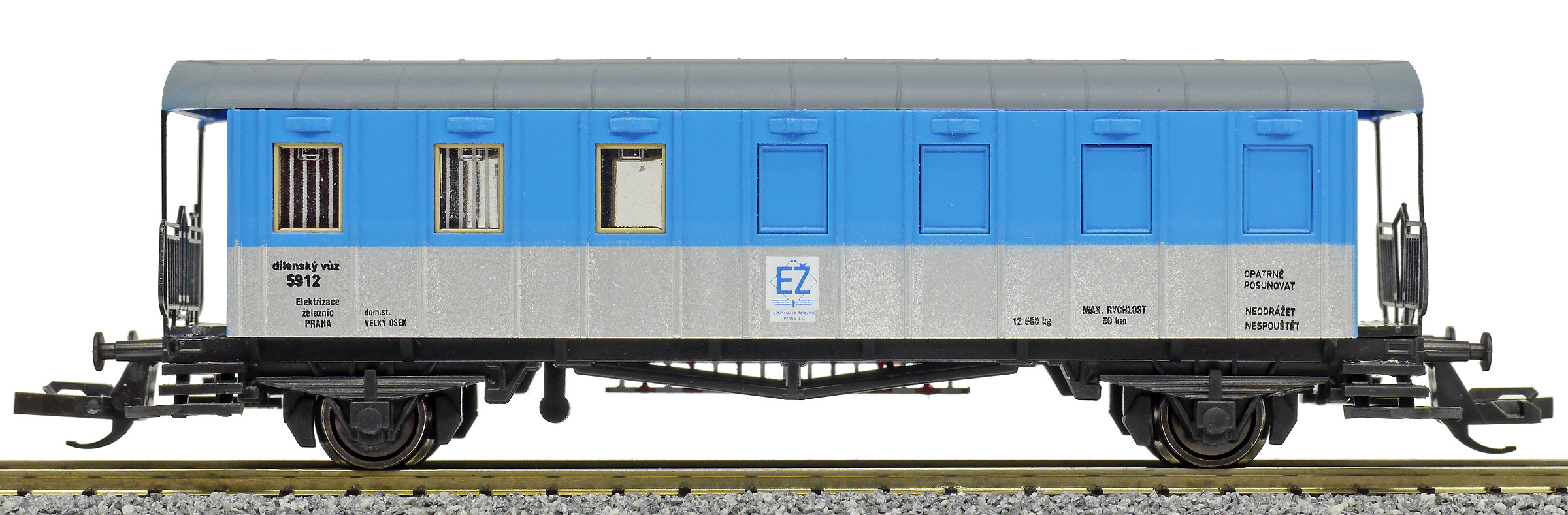 | dílenský vůz modrý-stříbrný s šedou střechou „Elektrizace železnic“ |