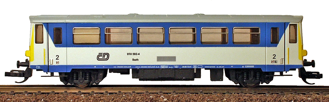 Popis   přívěsný vůz modrý-bílý s šedou střechou 2. tř.