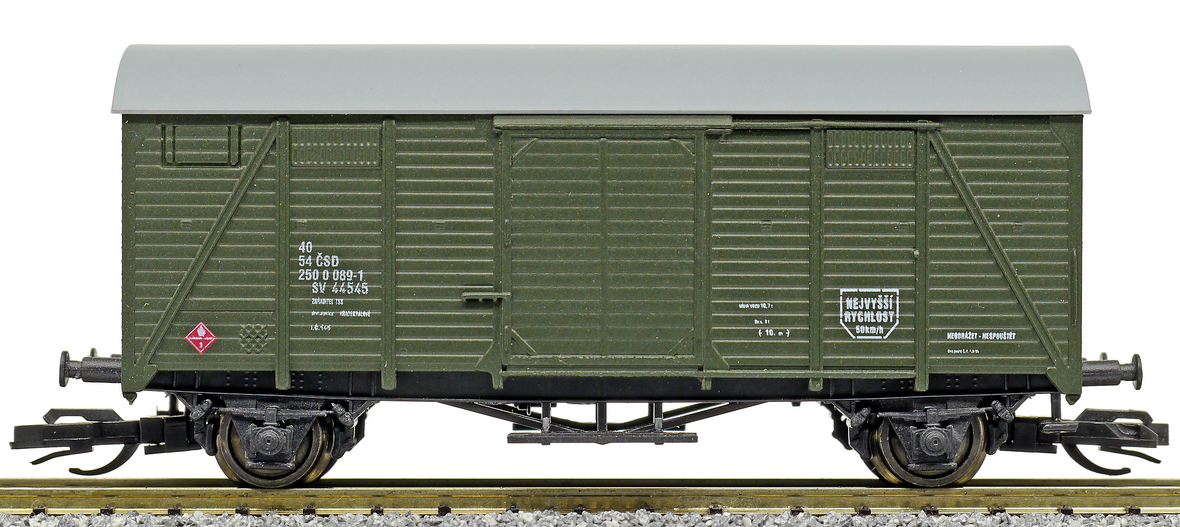 | krytý nákladní vůz zelený s šedou střechou do pracovního vlaku SV 44545 |