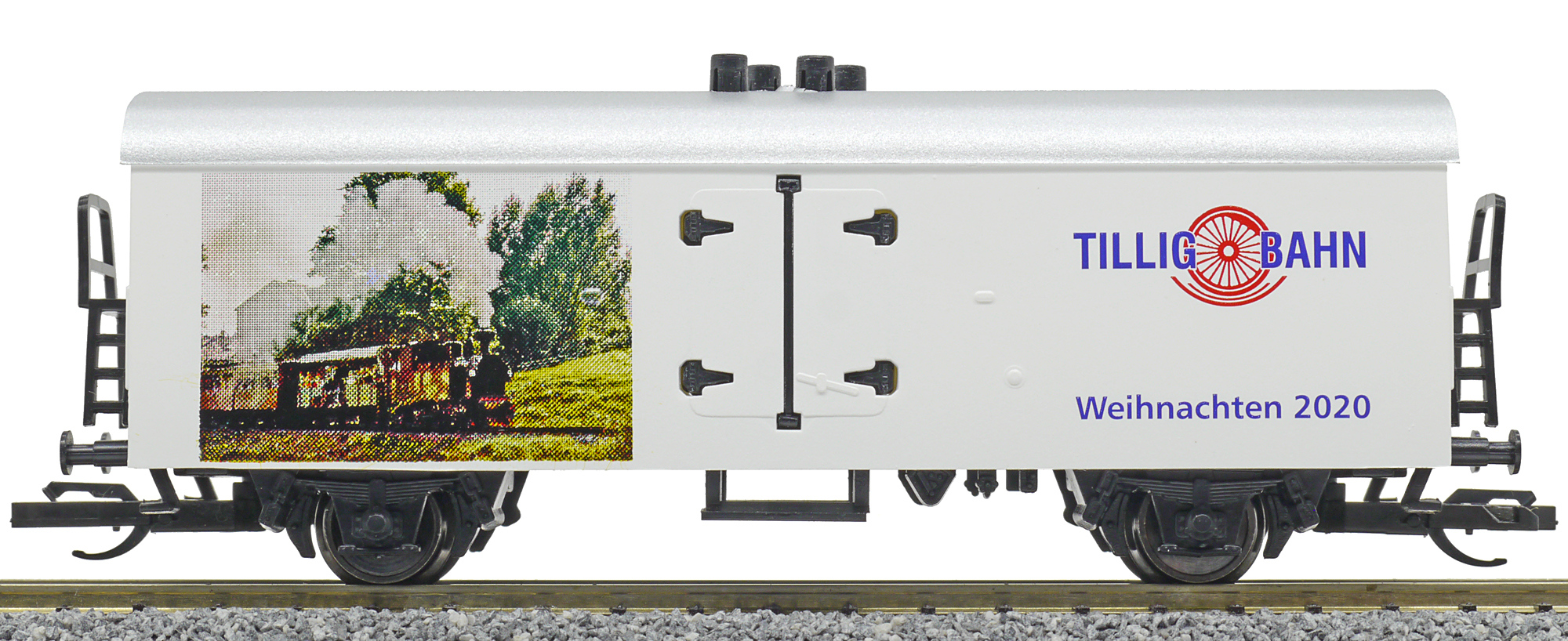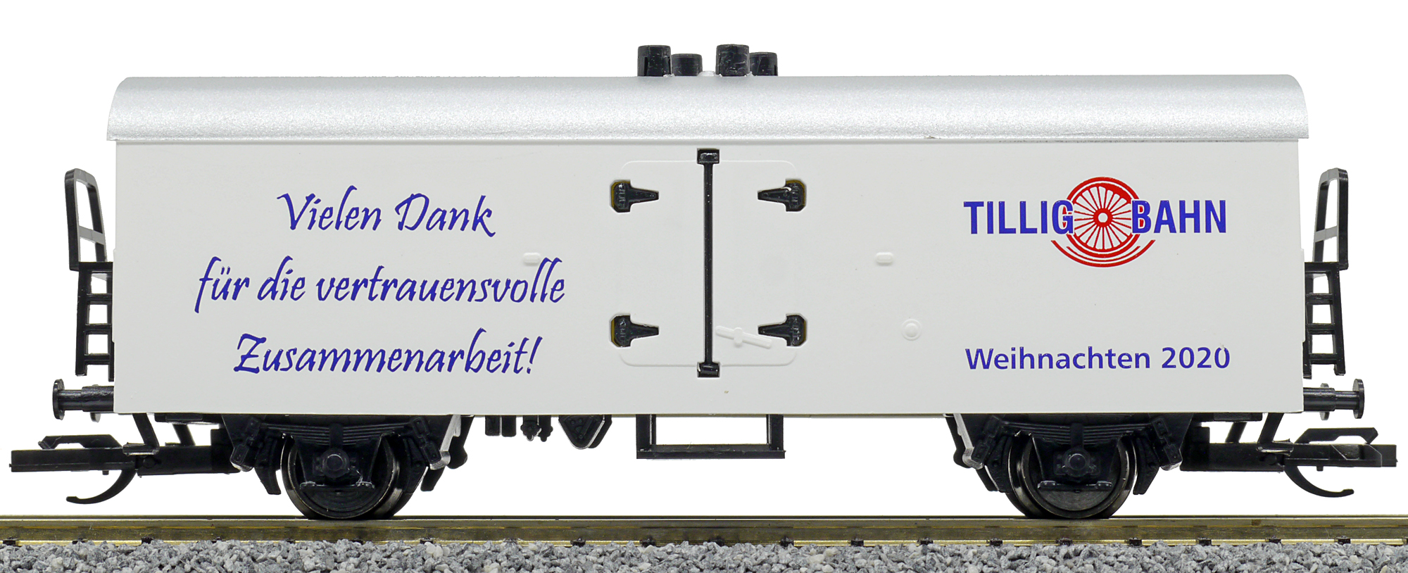 Kód   500940  [Nákladní vozy] → [Kryté] → [2-osé chladicí, pivní a reklamní] → 500940: bílý se stříbrnou střechou, vánoční Tillig 2009