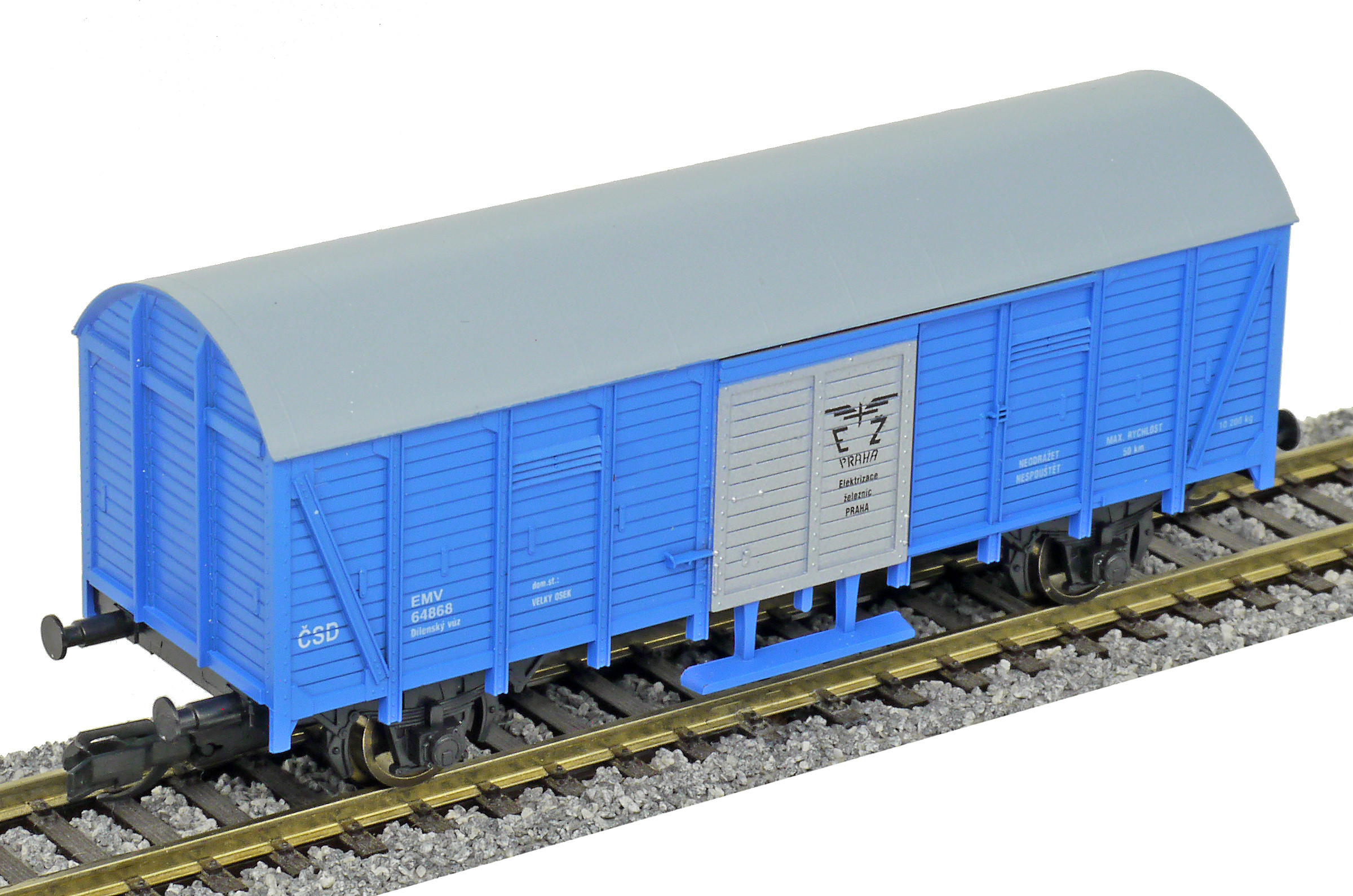 | krytý nákladní vůz modrý s šedou střechou a stříbrnými vraty dílenský vůz „Elektrizace železnic“ |
