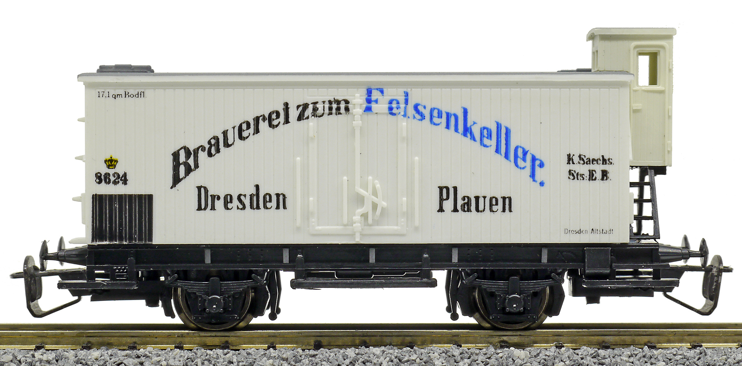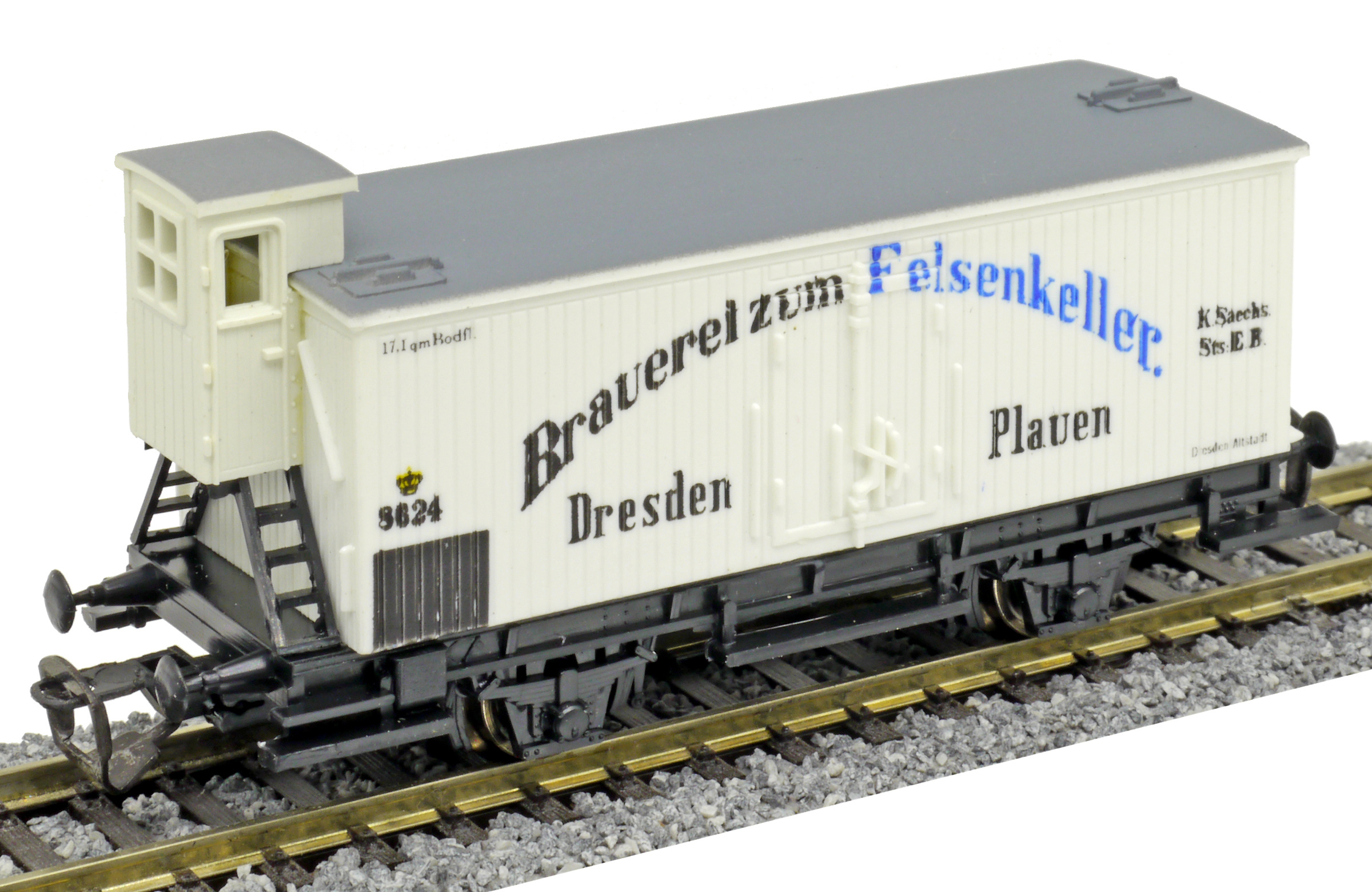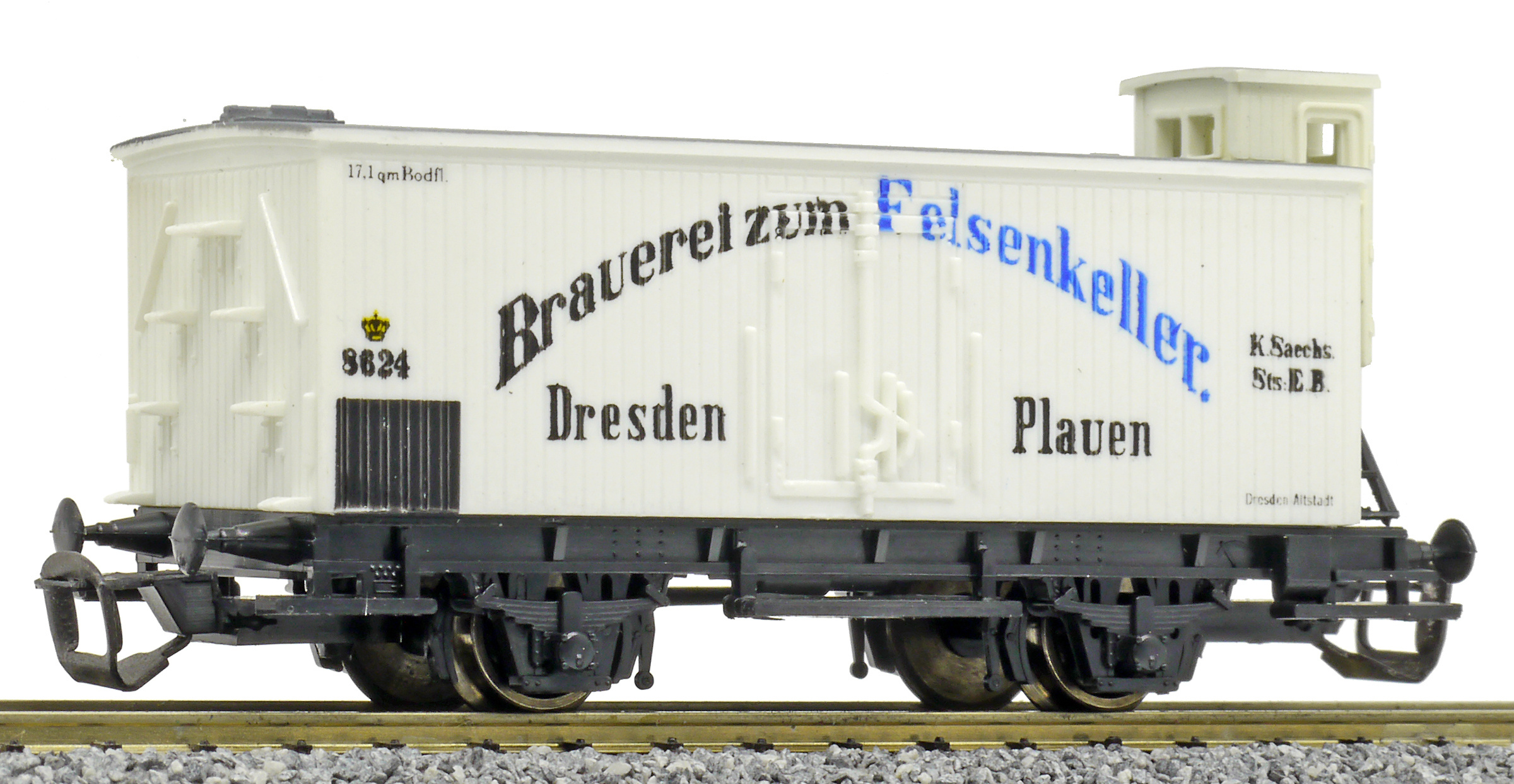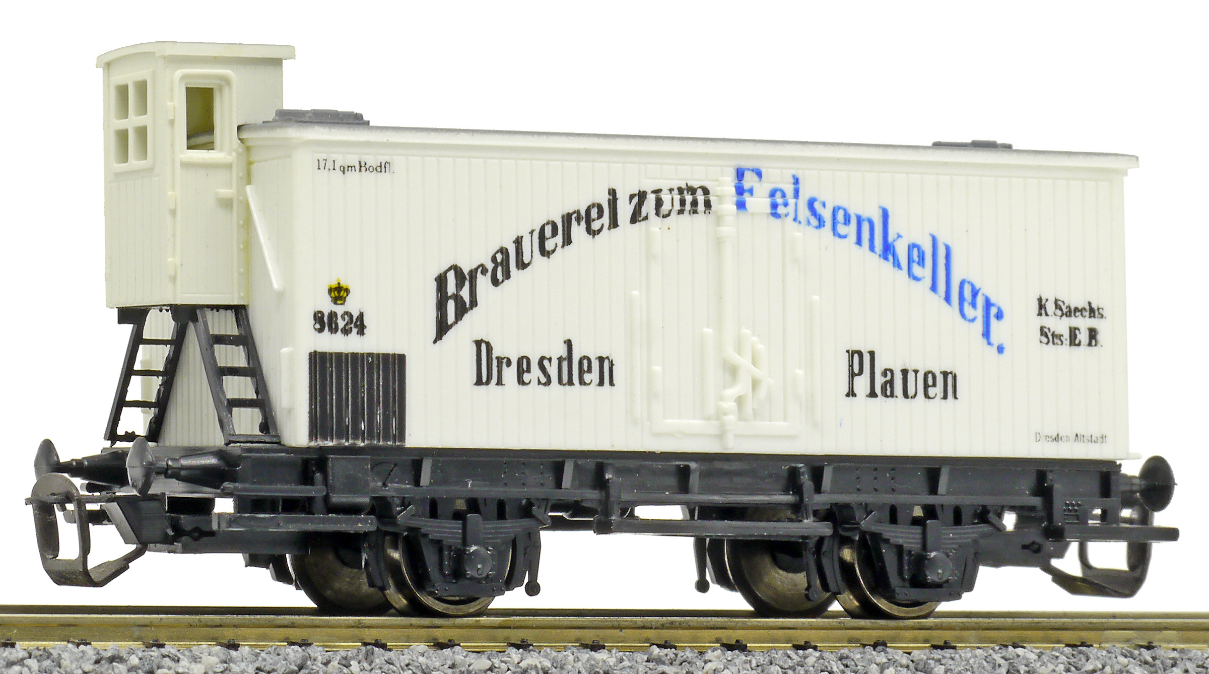 | nákladní chladící vůz bílý s šedou střechou a brzdařskou budkou „Felsenkeller“ |