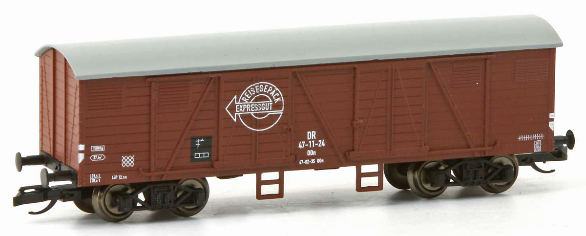 | krytý nákladní vůz červenohnědý s šedou střechou „Expressgut“ |
