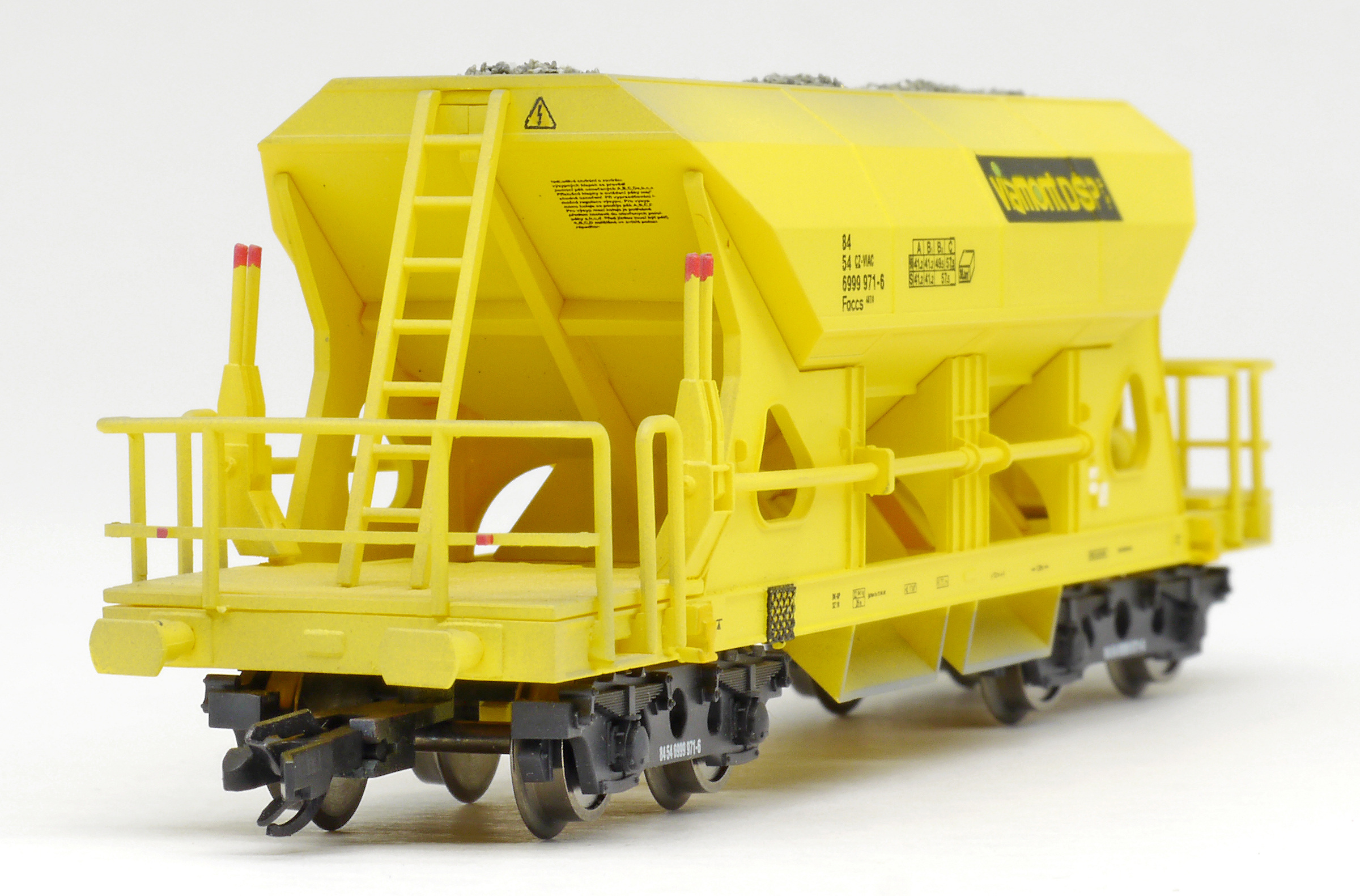 Kód   3518  [Nákladní vozy] → [Samovýsypné] → [4-osé Faccs (Sas)] → 3518: nákladní samovýsypný pracovní vůz žlutý s černým rámem s nákladem štěrku