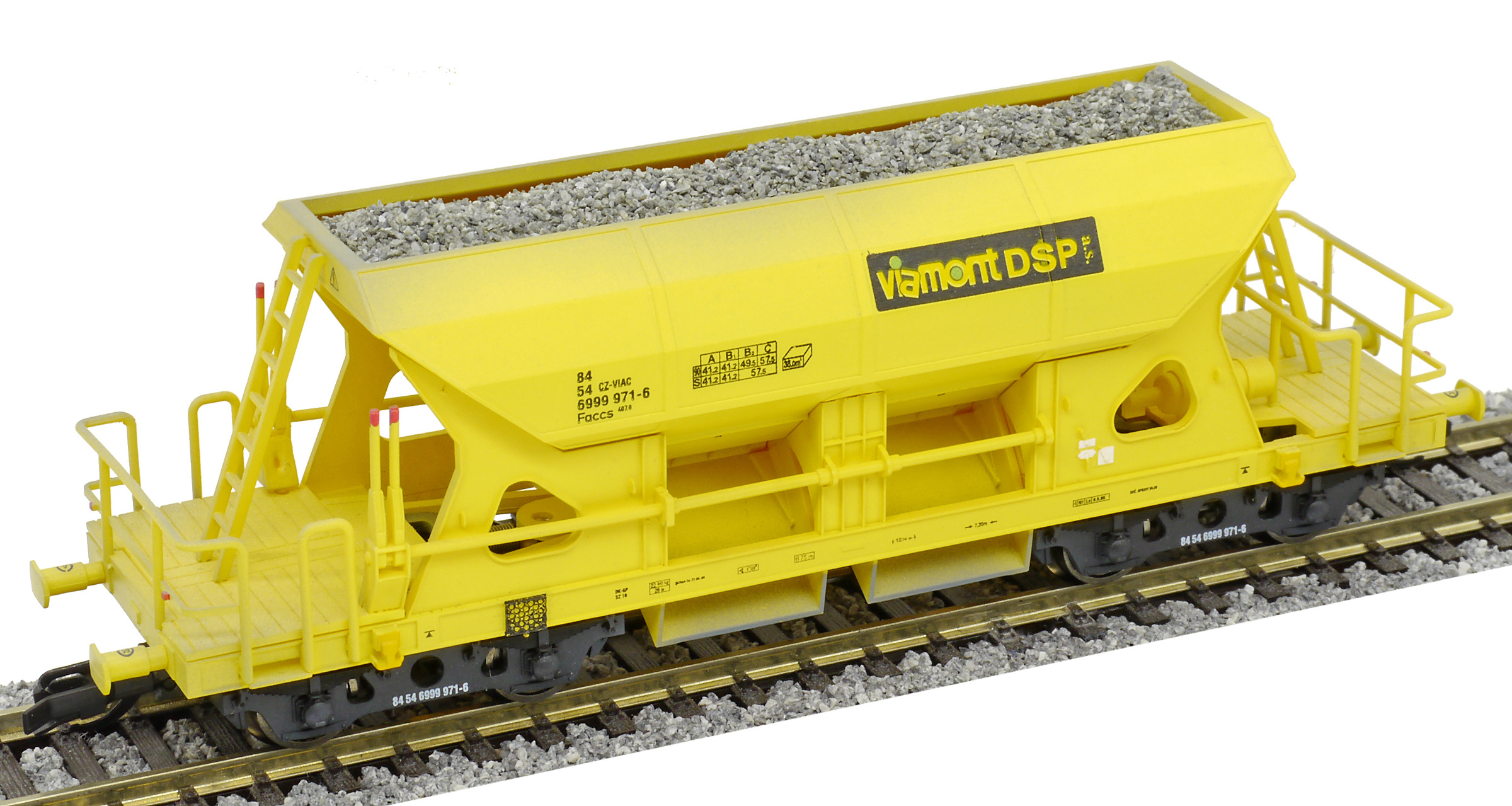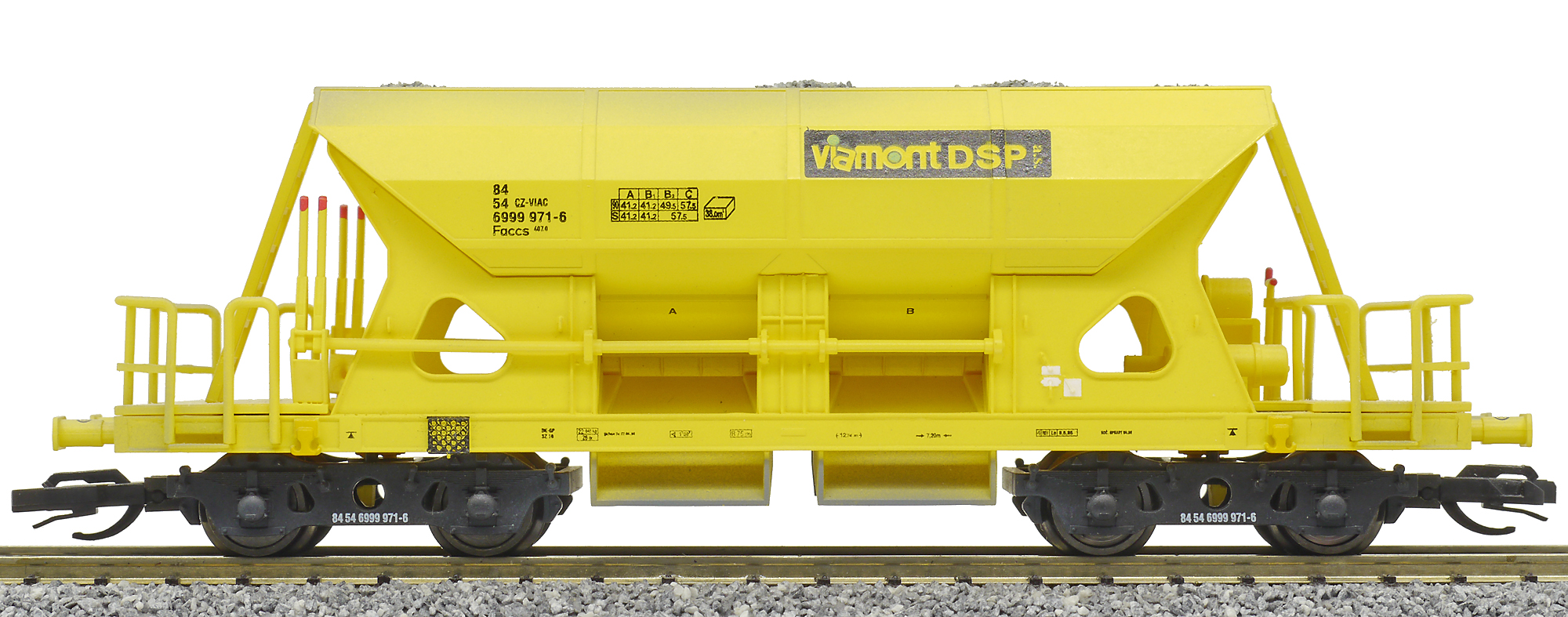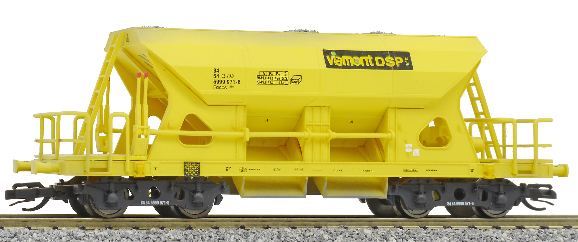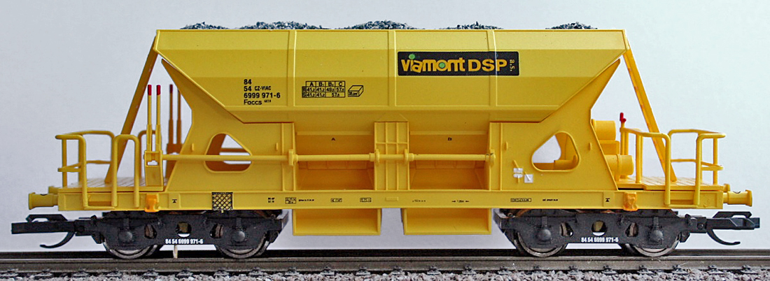 Kód   3519  [Nákladní vozy] → [Samovýsypné] → [4-osé Faccs (Sas)] → 3519: nákladní samovýsypný vůz žlutý s nákladem štěrku „Viamont“