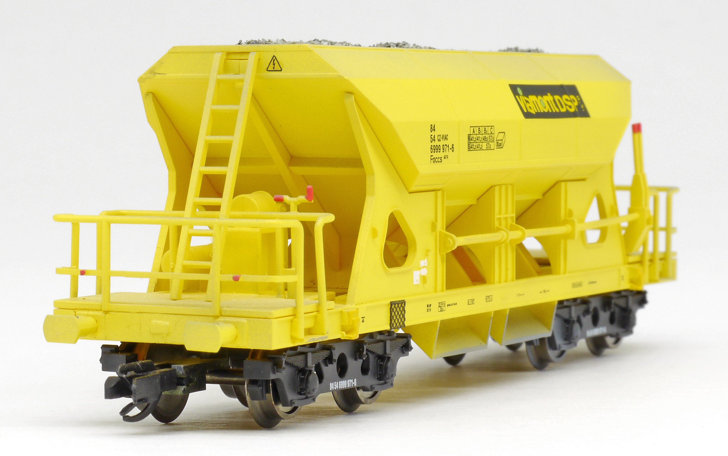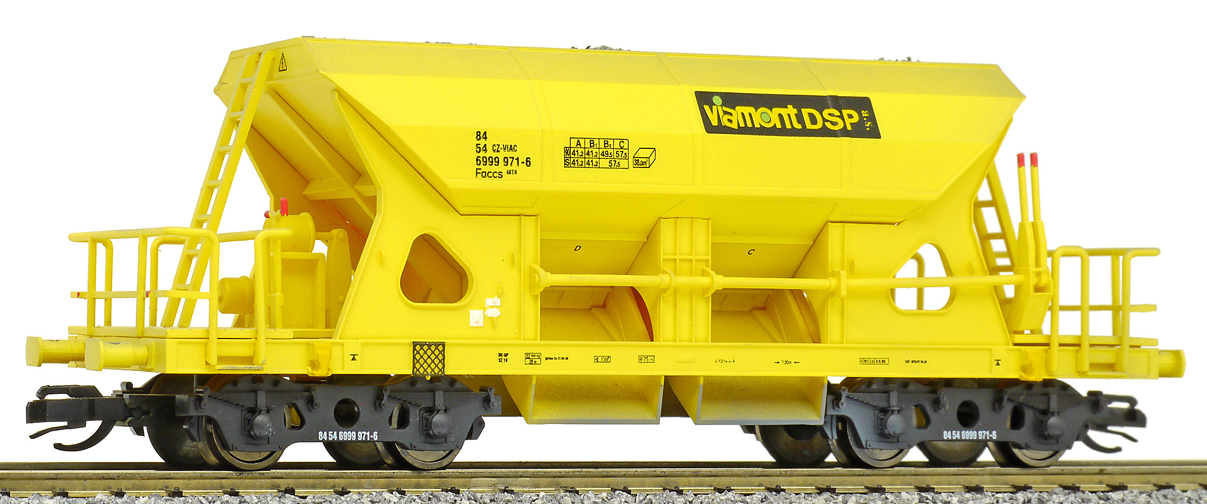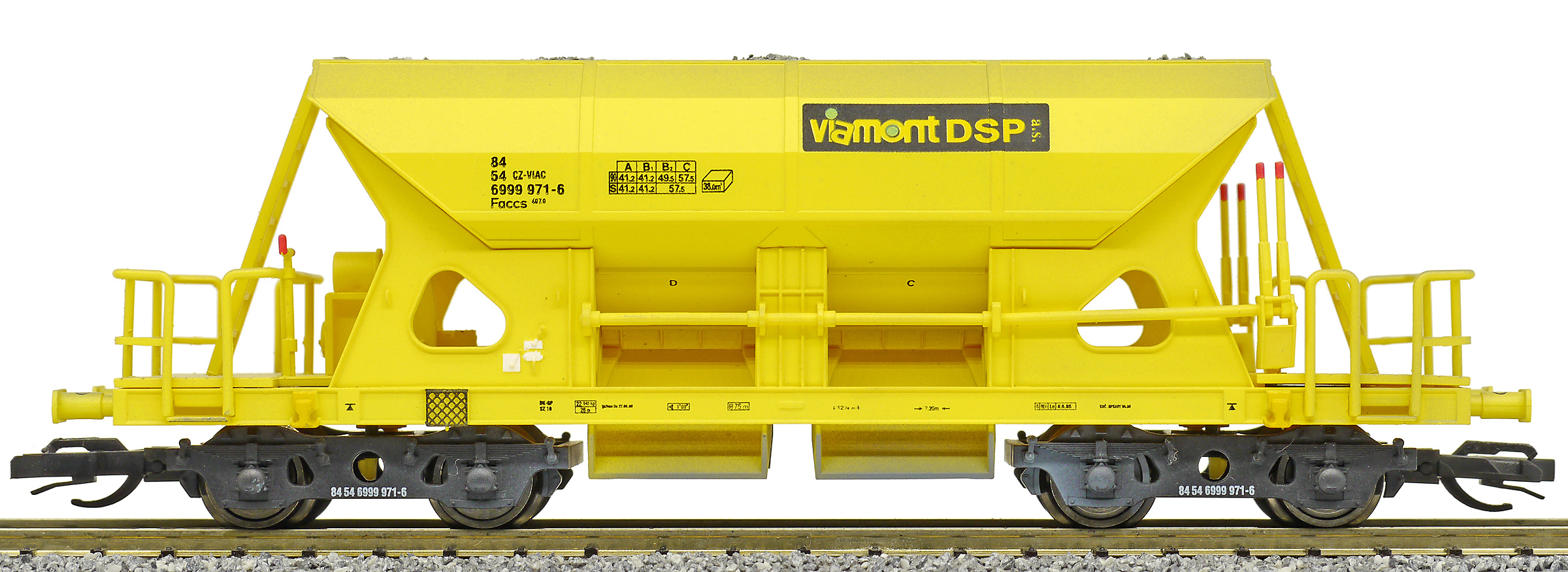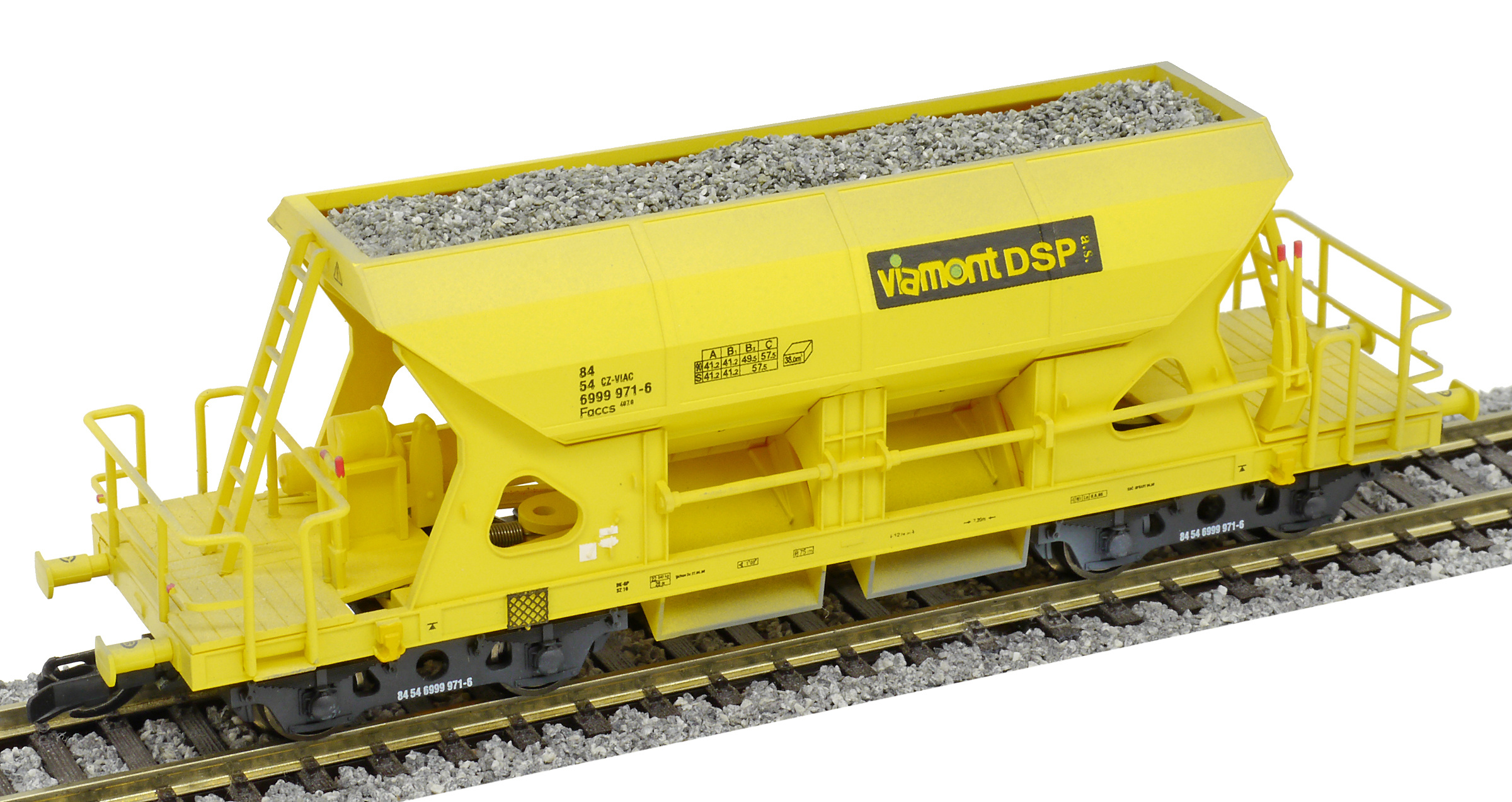 Kód   3519  [Nákladní vozy] → [Samovýsypné] → [4-osé Faccs (Sas)] → 3519: nákladní samovýsypný vůz žlutý s nákladem štěrku „Viamont“