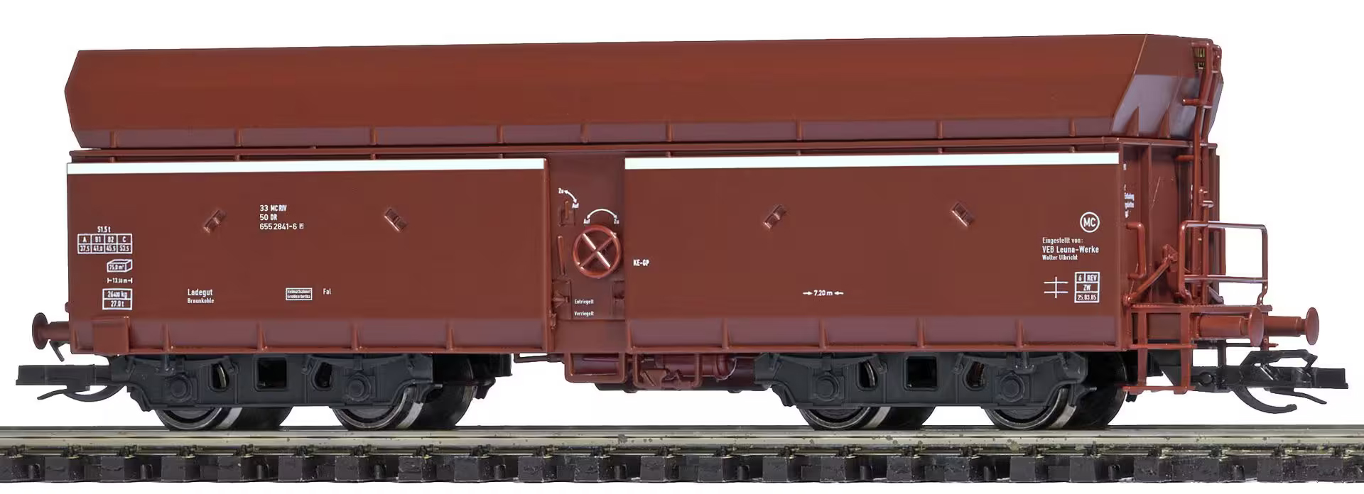 | nákladní samovýsypný vůz červenohnědý s brzdařskou plošinou „VEB Leuna-Werke Walter Ulbricht“ |