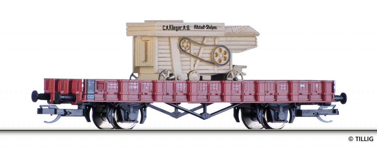 | nízkostěnný nákladní vůz červenohnědý s nákladem mlátičky |