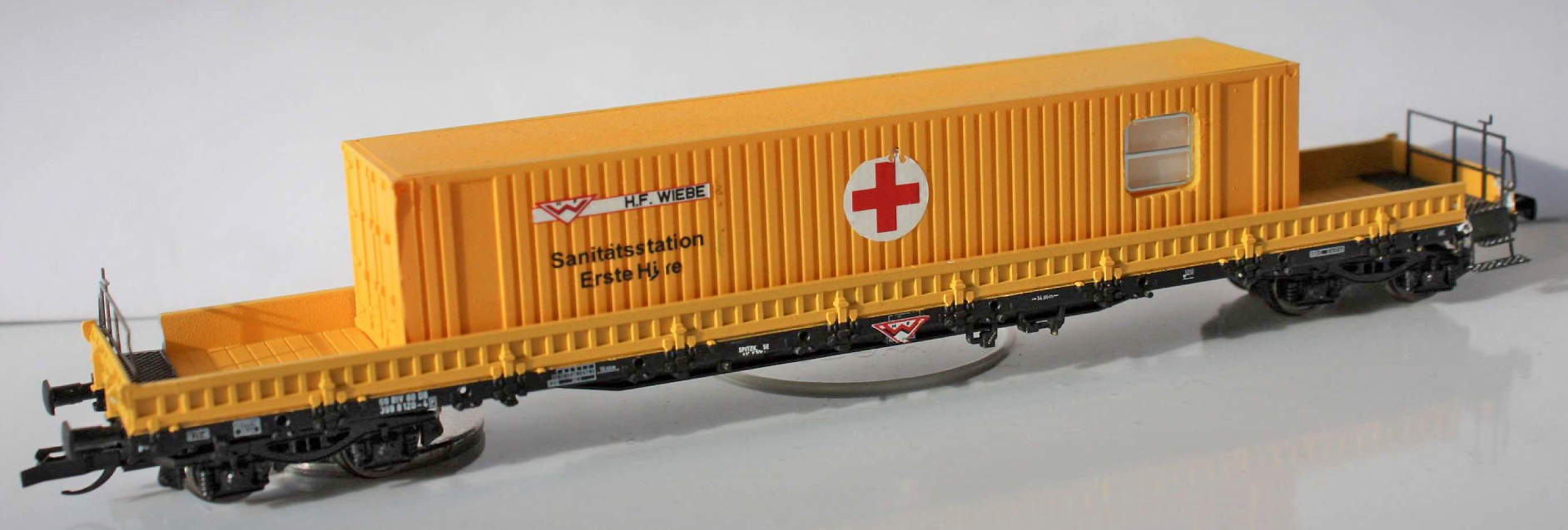 | nízkostěnný nákladní vůz oranžový se senitárním kontejnerem „H.F.Wiebe“ |