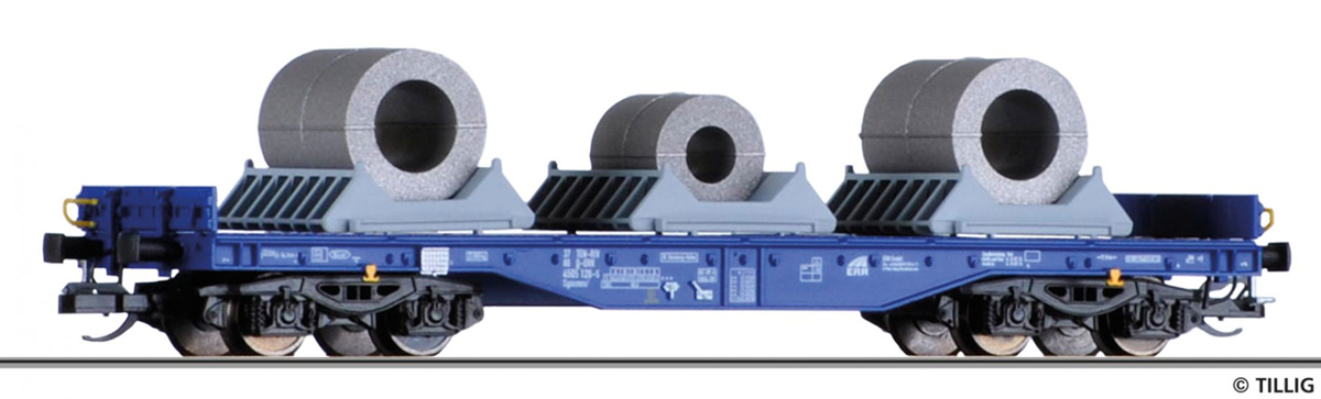 | plošinová nákladní vůz modrý s nákladem „European Rail Rent GmbH“ |