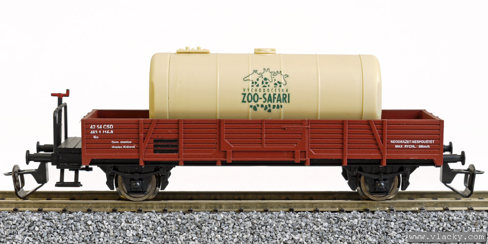 | nízkostěnný nákladní vůz červenohnědý s brzdařskou plošinou s cisterny „ZOO-SAFARI“ |