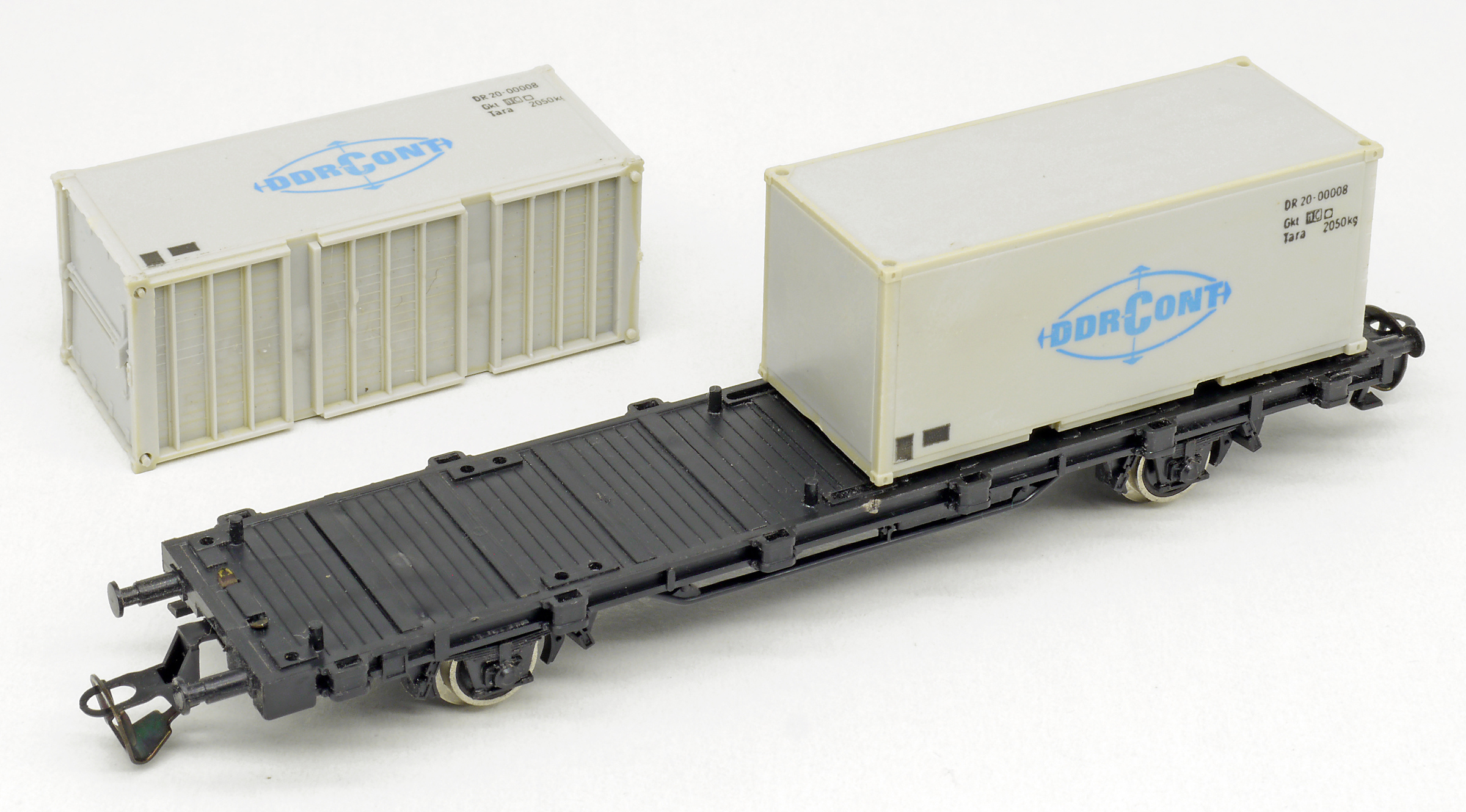 | nákladní plošinový vůz černý se dvěma 20' kontejnery „DDR-CONT“ |
