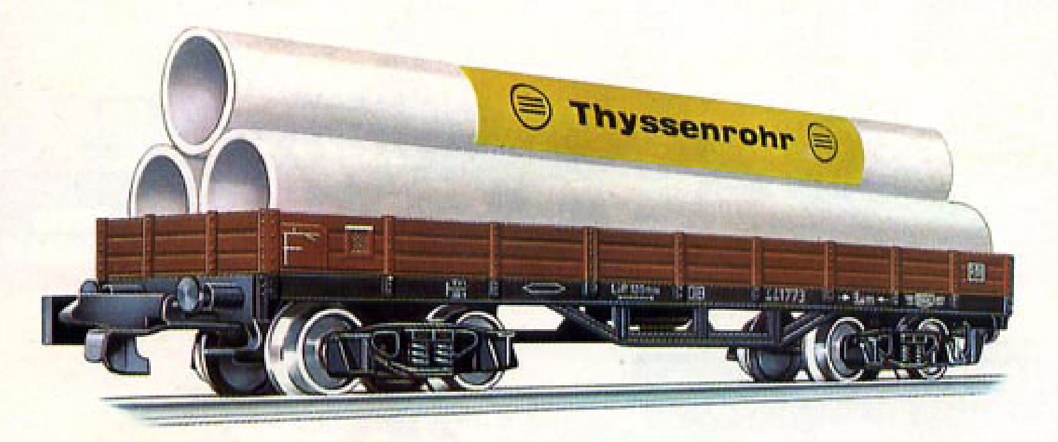 nízkostěnný nákladní vůz červenohnědý s černým rámem s nákladem rour „Thyssenrohr“